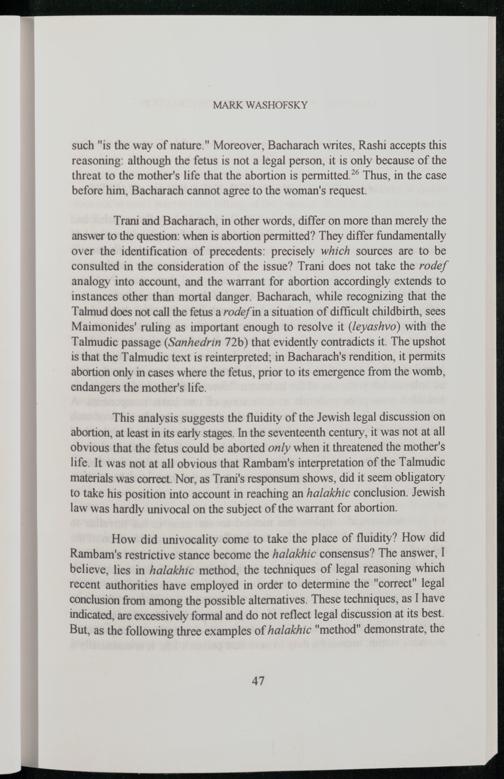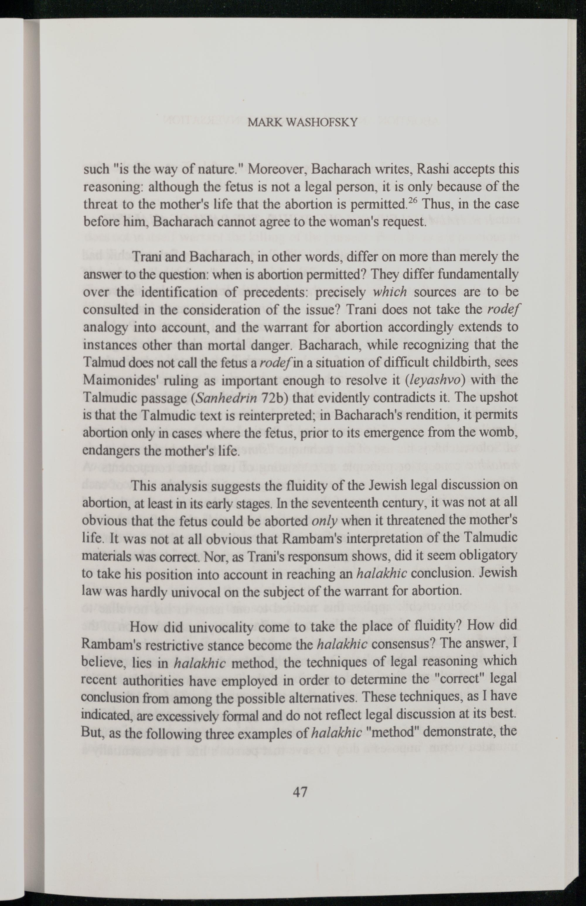 Trani and Bacharach, in other words, differ on more than merely the answer to the question: when is abortion permitted? They differ fundamentally over the identification of precedents: precisely which sources are to be consulted in the consideration of the issue? Trani does not take the rodef analogy into account, and the warrant for abortion accordingly extends to instances other than mortal danger. Bacharach, while recognizing that the Talmud does not call the fetus a rodef in a situation of difficult childbirth, sees Maimonides ' ruling as important enough to resolve it(leyashvo) with the Talmudic passage(Sanhedrin 72b) that evidently contradicts it. The upshot is that the Talmudic text is reinterpreted; in Bacharach's rendition, it permits abortion only in cases where the fetus, prior to its emergence from the womb, endangers the mother's life.