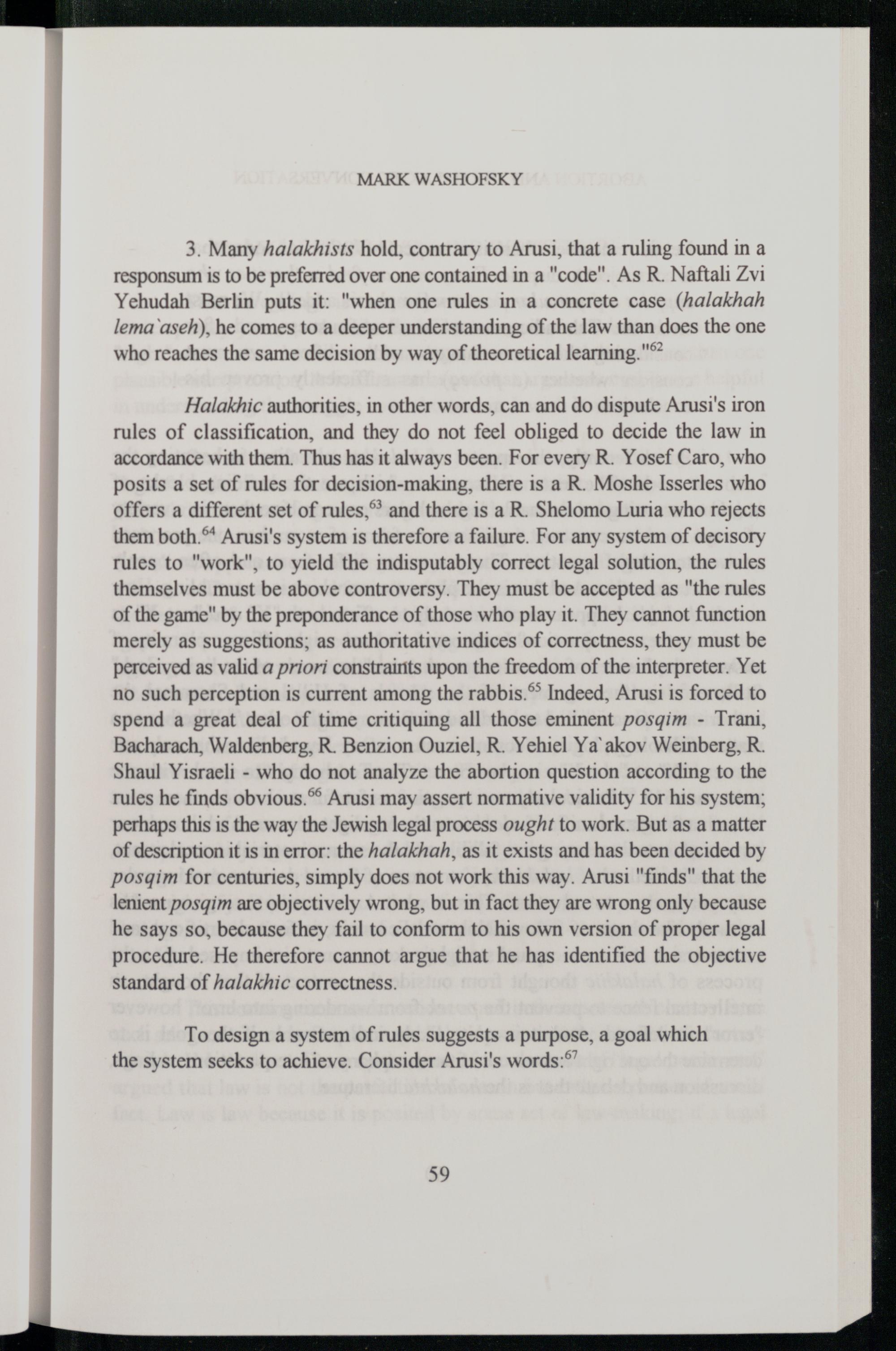 Halakhic authorities, in other words, can and do dispute Arusi's iron rules of classification, and they do not feel obliged to decide the law in accordance with them. Thus has it always been. For every R. Yosef Caro , who posits a set of rules for decision-making, there is a R. Moshe Isserles who offers a different set of rules,*® and there is a R. Shelomo Luria who rejects them both.** Arusi's system is therefore a failure. For any system of decisory rules to"work", to yield the indisputably correct legal solution, the rules themselves must be above controversy. They must be accepted as"the rules of the game" by the preponderance of those who play it. They cannot function merely as suggestions; as authoritative indices of correctness, they must be perceived as valid a priori constraints upon the freedom of the interpreter. Yet no such perception is current among the rabbis.®® Indeed, Arusi is forced to spend a great deal of time critiquing all those eminent posgim- Trani, Bacharach, Waldenberg , R. Benzion Ouziel, R. Yehiel Ya'akov Weinberg, R. Shaul Yisraeli- who do not analyze the abortion question according to the rules he finds obvious.®® Arusi may assert normative validity for his system; perhaps this is the way the Jewish legal process ought to work. But as a matter of description it is in error: the halakhah, as it exists and has been decided by posqim for centuries, simply does not work this way. Arusi"finds" that the lenient posqim are objectively wrong, but in fact they are wrong only because he says so, because they fail to conform to his own version of proper legal procedure. He therefore cannot argue that he has identified the objective standard of halakhic correctness.
