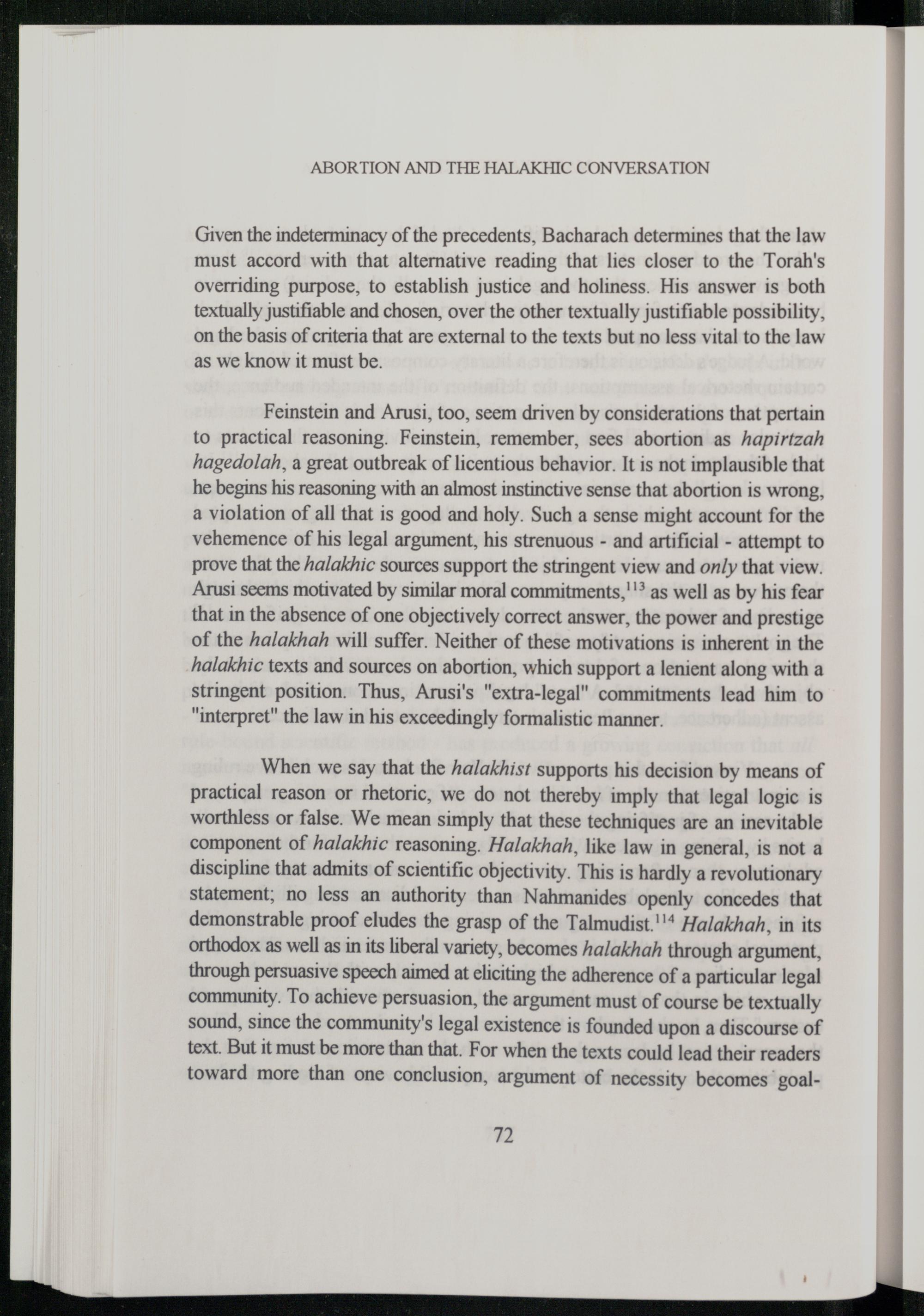 Feinstein and Arusi, too, seem driven by considerations that pertain to practical reasoning. Feinstein, remember, sees abortion as hapirtzah hagedolah, a great outbreak of licentious behavior. It is not implausible that he begins his reasoning with an almost instinctive sense that abortion is wrong, a violation of all that is good and holy. Such a sense might account for the vehemence of his legal argument, his strenuous- and artificial- attempt to prove that the halakhic sources support the stringent view and only that view. Arusi seems motivated by similar moral commitments,’ as well as by his fear that in the absence of one objectively correct answer, the power and prestige of the halakhah will suffer. Neither of these motivations is inherent in the halakhic texts and sources on abortion, which support a lenient along with a stringent position. Thus, Arusi's"extra-legal" commitments lead him to "interpret" the law in his exceedingly formalistic manner.