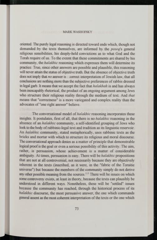 The conversational model of halakhic reasoning incorporates these insights. It postulates, first of all, that there is no halakhic reasoning in the absence of an halakhic community, a self-identified grouping of Jews who look to the body of rabbinic-legal text and tradition as its linguistic reservoir. An halakhic community, stated metaphorically, uses rabbinic texts as the bricks and mortar with which to structure its religious and moral discourse. The conversational approach denies as a matter of principle that demonstrable logical proof is the goal or even a serious possibility of this activity. The aim, rather, is persuasion, whose achievement is a matter of considerable ambiguity. At times, persuasion is easy. There will be halakhic propositions that are not at all controversial, not necessarily because they are objectively inherent in the texts(inscribed, as it were, in the"fabric of the Toraitic universe") but because the members of the community simply do not derive any other possible meaning from the sources.''® There will be issues on which some controversy exists, at least in theory, because the texts can plausibly be understood in different ways. Nonetheless, these will be"settled" issues because the community has reached, through the historical process of its halakhic discourse, the most persuasive answer, the one which commands general assent as the most coherent interpretation of the texts or the one which