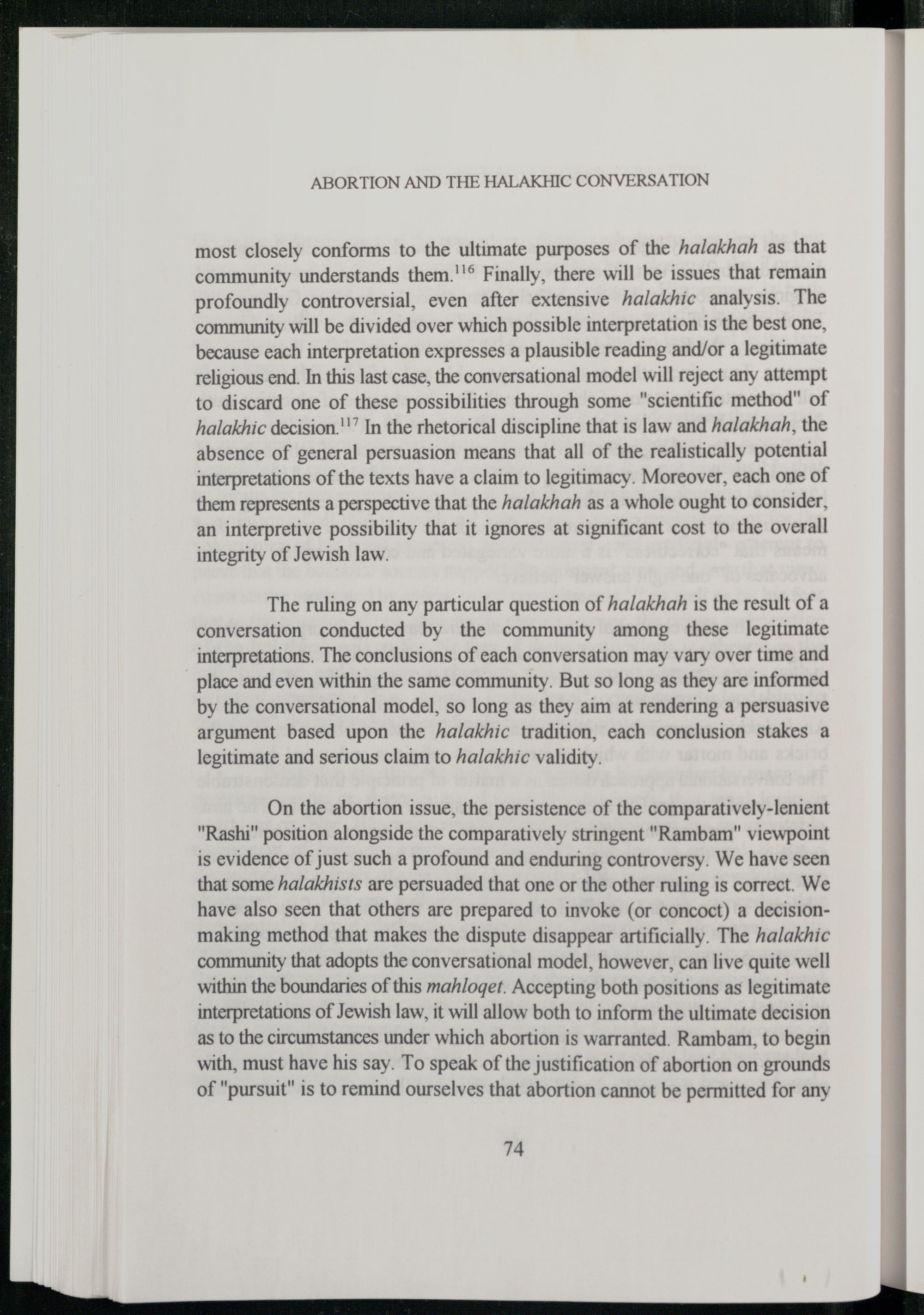most closely conforms to the ultimate purposes of the halakhah as that community understands them.’ Finally, there will be issues that remain profoundly controversial, even after extensive halakhic analysis. The community will be divided over which possible interpretation is the best one, because each interpretation expresses a plausible reading and/or a legitimate religious end. In this last case, the conversational model will reject any attempt to discard one of these possibilities through some"scientific method" of halakhic decision."” In the rhetorical discipline that is law and halakhah, the absence of general persuasion means that all of the realistically potential interpretations of the texts have a claim to legitimacy. Moreover, each one of them represents a perspective that the halakhah as a whole ought to consider, an interpretive possibility that it ignores at significant cost to the overall integrity of Jewish law.