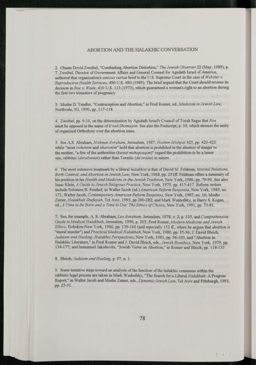 6. The most extensive treatment by a liberal halakhist is that of David M. Feldman, Marital Relations, Birth Control , and Abortion in Jewish Law, New York , 1968, pp. 251ff. Feldman offers a summary of his position in his Health and Medicine in the Jewish Tradition, New York , 1986, pp. 79-90. See also Isaac Klein , 4 Guide to Jewish Religious Practice, New York , 1979, pp. 415-417. Reform writers include Solomon B. Freehof , in Walter Jacob (ed.) American Reform Responsa, New York , 1983, no. 171, Walter Jacob , Contemporary American Reform Responsa, New York , 1987, no. 16; Moshe Zemer , Halakhah Shefuyah, Tel Aviv , 1993, pp.280-282; and Mark Washofsky, in Barry S. Kogan, ed., A Time to Be Born and a Time to Die: The Ethics of Choice, New York , 1991, pp. 73-81.