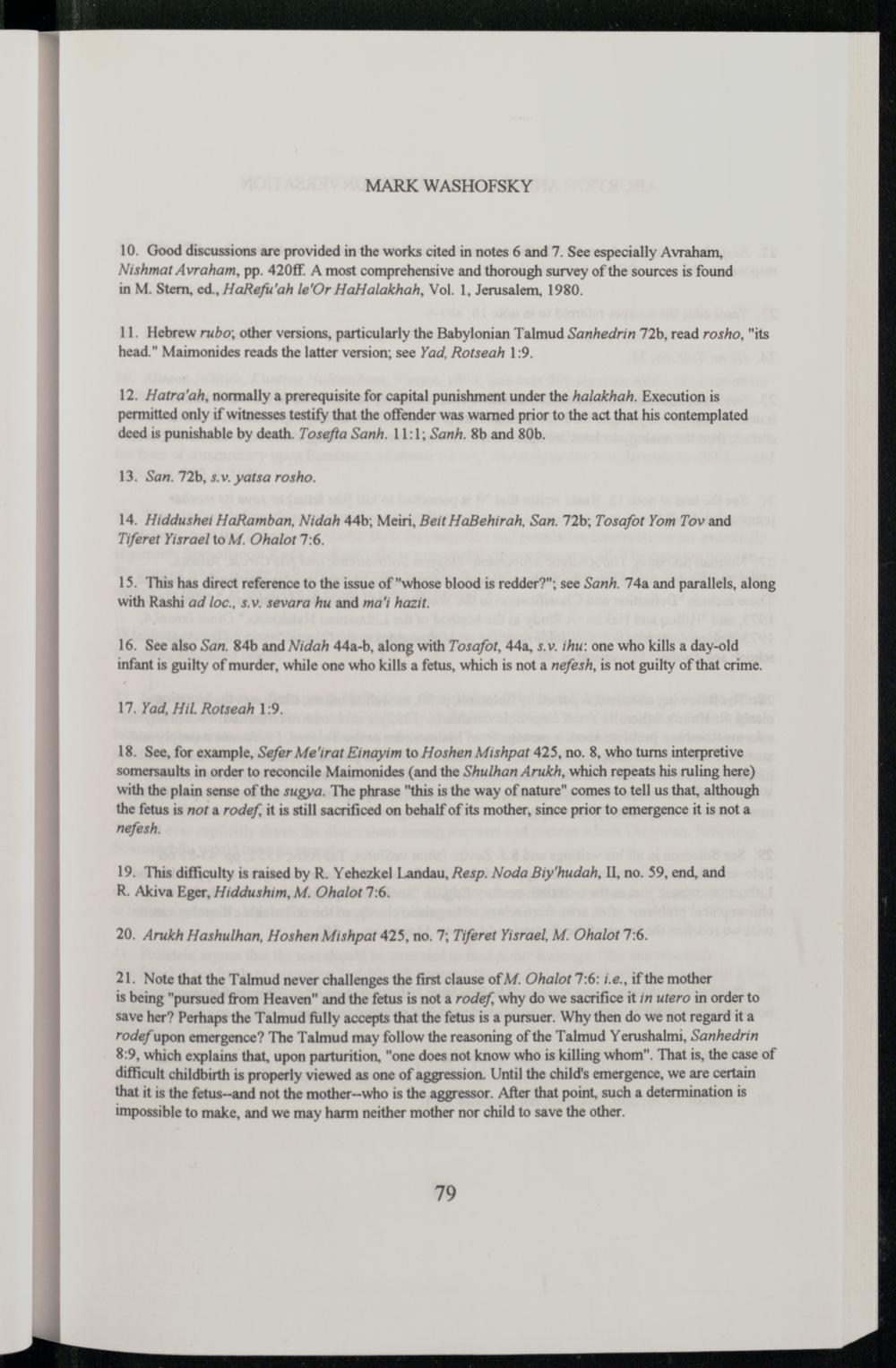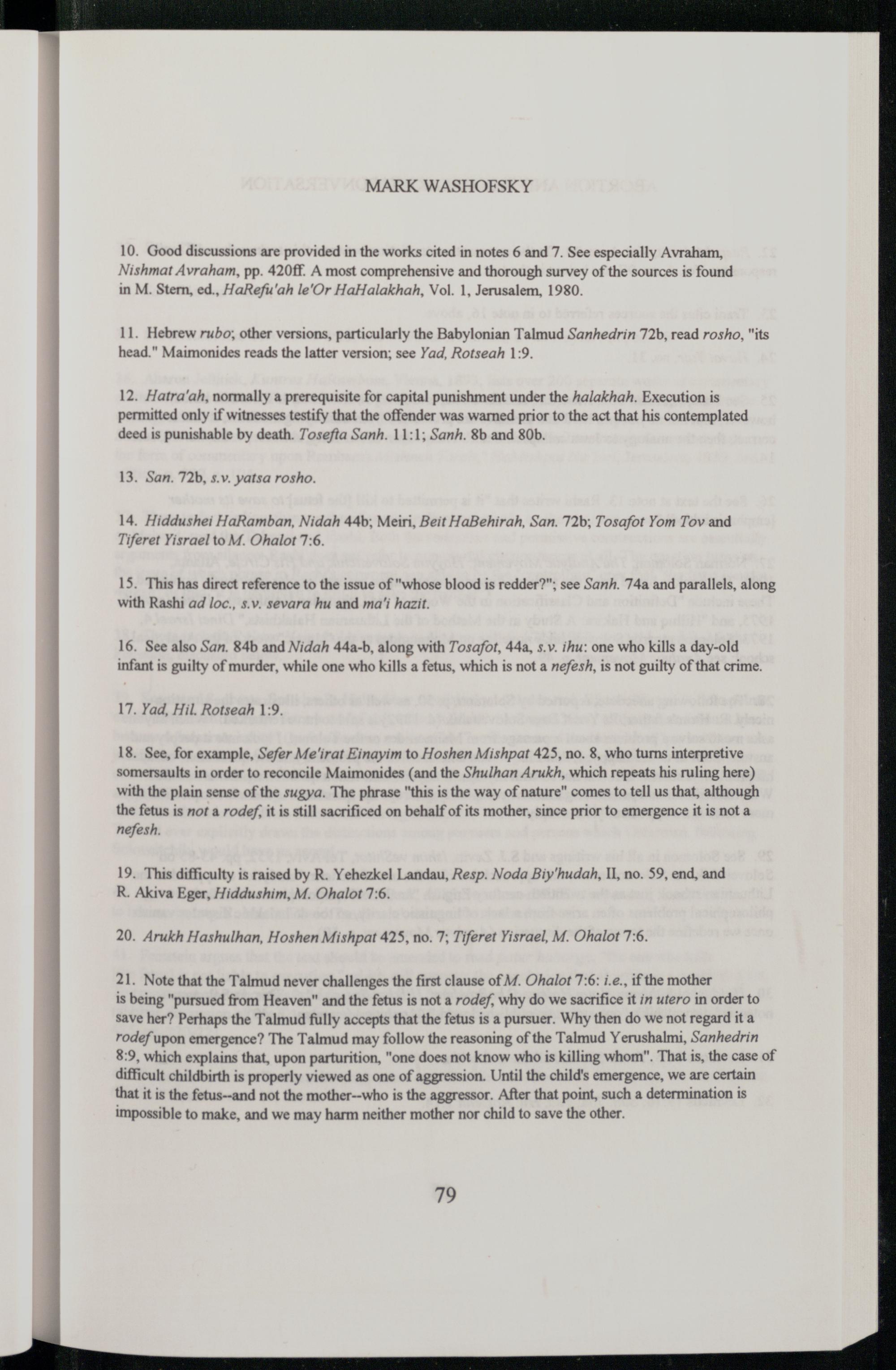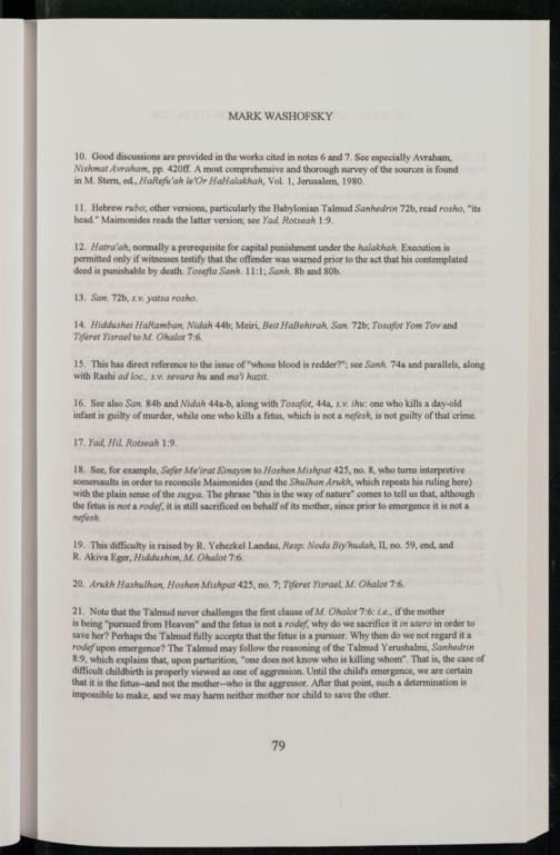 18. See, for example, Sefer Me'irat Einayim to Hoshen Mishpat 425, no. 8, who turns interpretive somersaults in order to reconcile Maimonides (and the Shulhan Arukh, which repeats his ruling here) with the plain sense of the sugya. The phrase"this is the way of nature" comes to tell us that, although the fetus is not a rodef, it is still sacrificed on behalf of its mother, since prior to emergence it is not a nefesh.