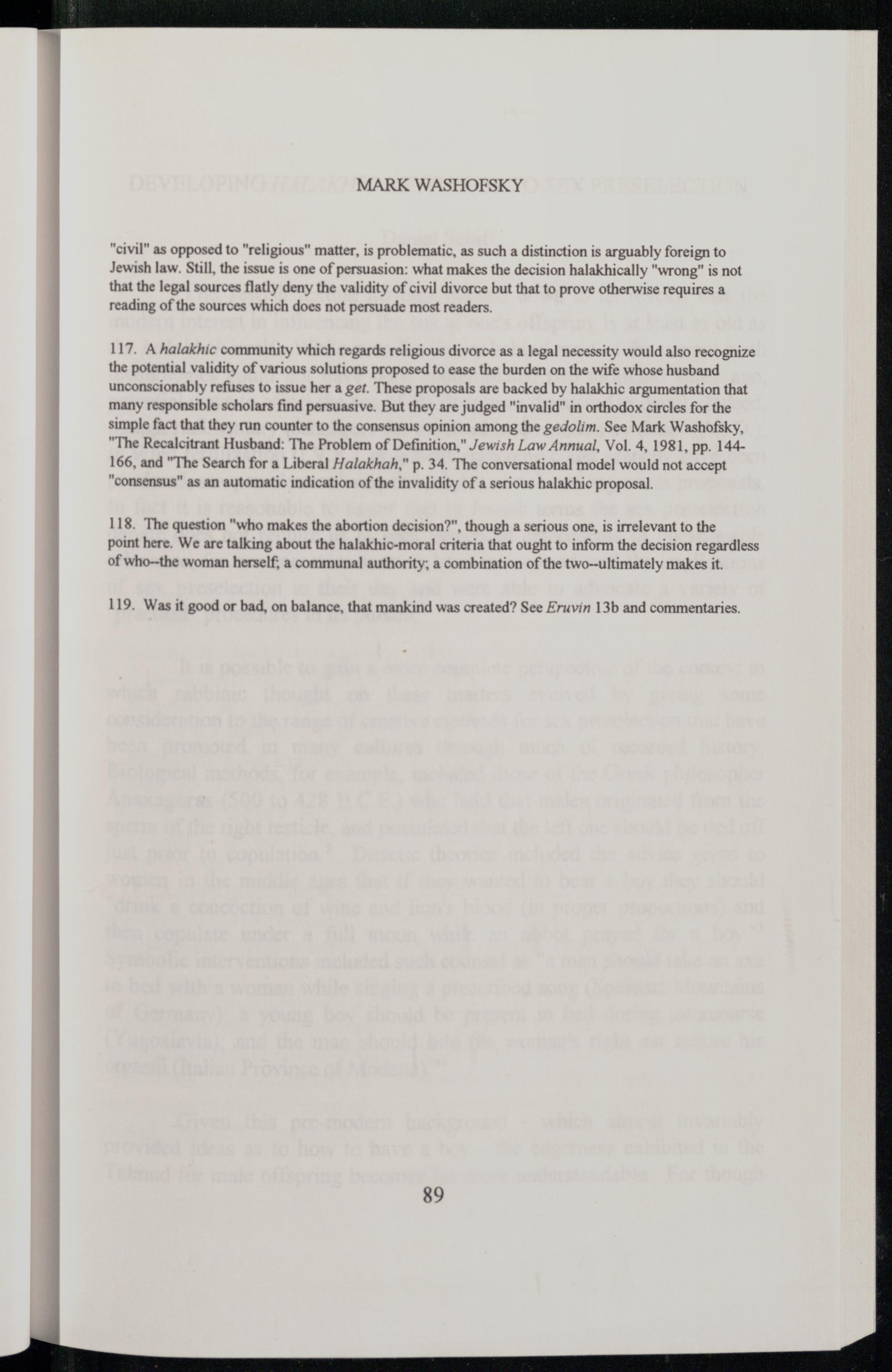 117. A halakhic community which regards religious divorce as a legal necessity would also recognize the potential validity of various solutions proposed to ease the burden on the wife whose husband unconscionably refuses to issue her a get. These proposals are backed by halakhic argumentation that many responsible scholars find persuasive. But they are judged"invalid" in orthodox circles for the simple fact that they run counter to the consensus opinion among the gedolim. See Mark Washofsky, "The Recalcitrant Husband: The Problem of Definition," Jewish Law Annual, Vol. 4, 1981, pp. 144166, and"The Search for a Liberal Halakhah," p. 34. The conversational model would not accept "consensus" as an automatic indication of the invalidity of a serious halakhic proposal.