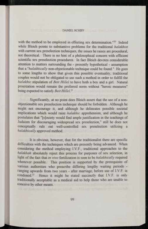 with the method to be employed in effecting sex determination."?® Indeed while Bleich points to substantive problems for the traditional halakhist with current sex preselection techniques, the issues he raises are procedural, not theoretical. There is no hint of a philosophical concern with efficient scientific sex preselection procedures. In fact Bleich devotes considerable attention to matters surrounding the- presently hypothetical- assumption that a"halakhically non-objectionable technique could be found." He goes to some lengths to show that given this possible eventuality, traditional couples would not be obligated to use such a method in order to fulfill the halakhic stipulation of Beit Hillel to have both a boy and a girl. Natural procreation would remain the preferred norm without"heroic measures" being expected to satisfy Beit Hillel*'
