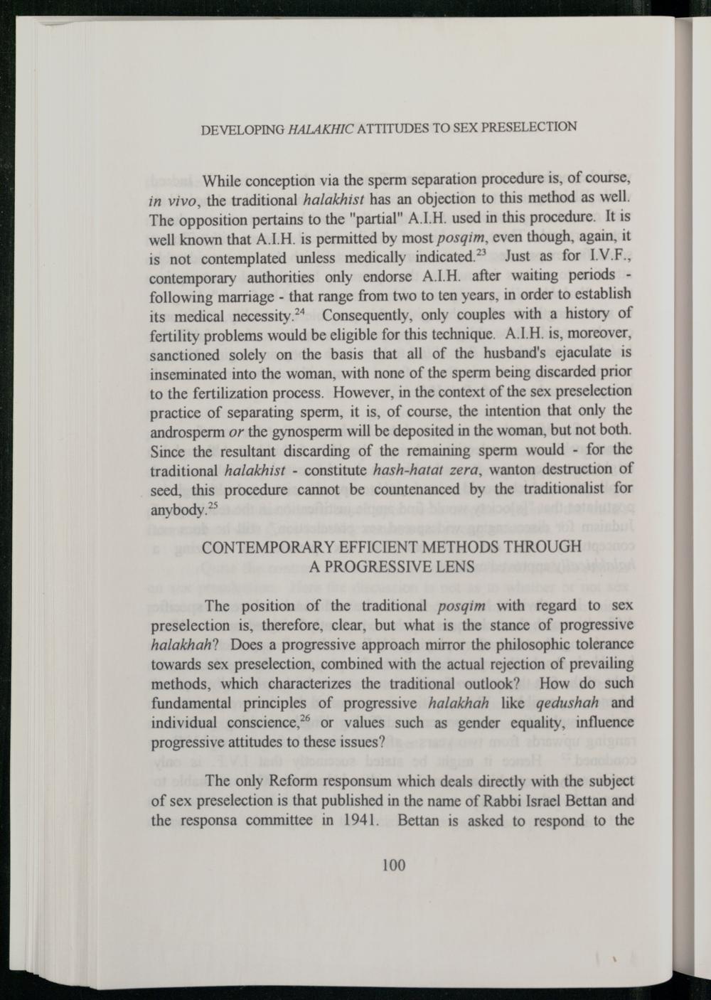 The position of the traditional posgim with regard to sex preselection is, therefore, clear, but what is the stance of progressive halakhah? Does a progressive approach mirror the philosophic tolerance towards sex preselection, combined with the actual rejection of prevailing methods, which characterizes the traditional outlook? How do such fundamental principles of progressive halakhah like qedushah and individual conscience,” or values such as gender equality, influence progressive attitudes to these issues?