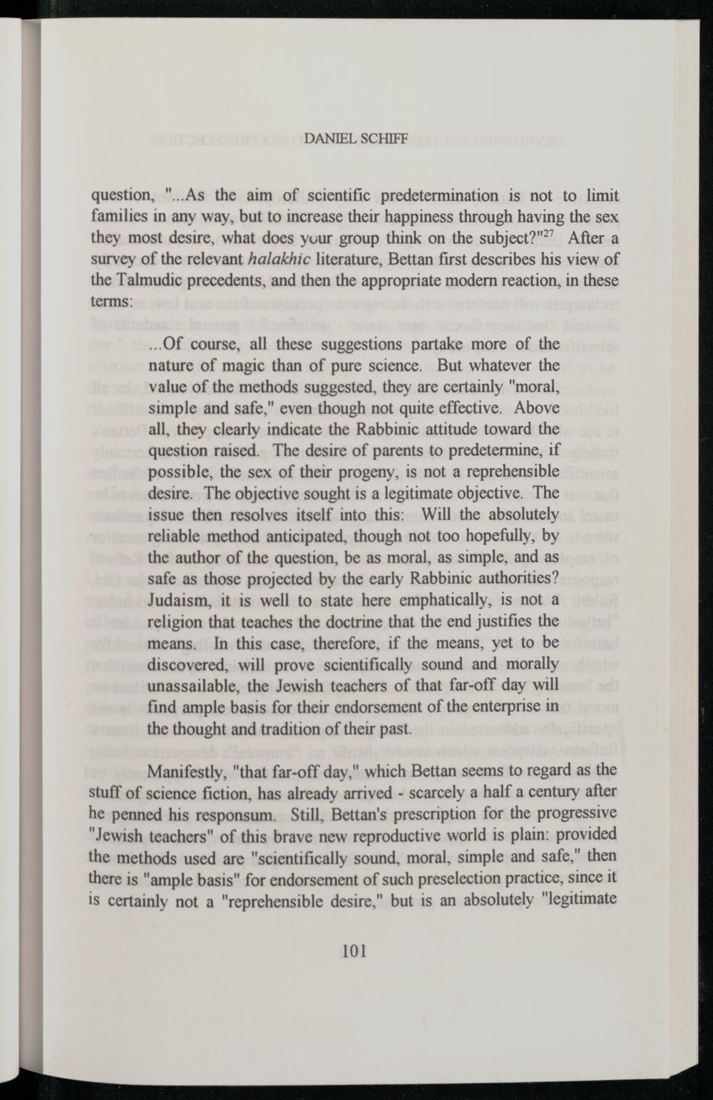 question,"..As the aim of scientific predetermination is not to limit families in any way, but to increase their happiness through having the sex they most desire, what does your group think on the subject?"?” After a survey of the relevant halakhic literature, Bettan first describes his view of the Talmudic precedents, and then the appropriate modern reaction, in these terms: