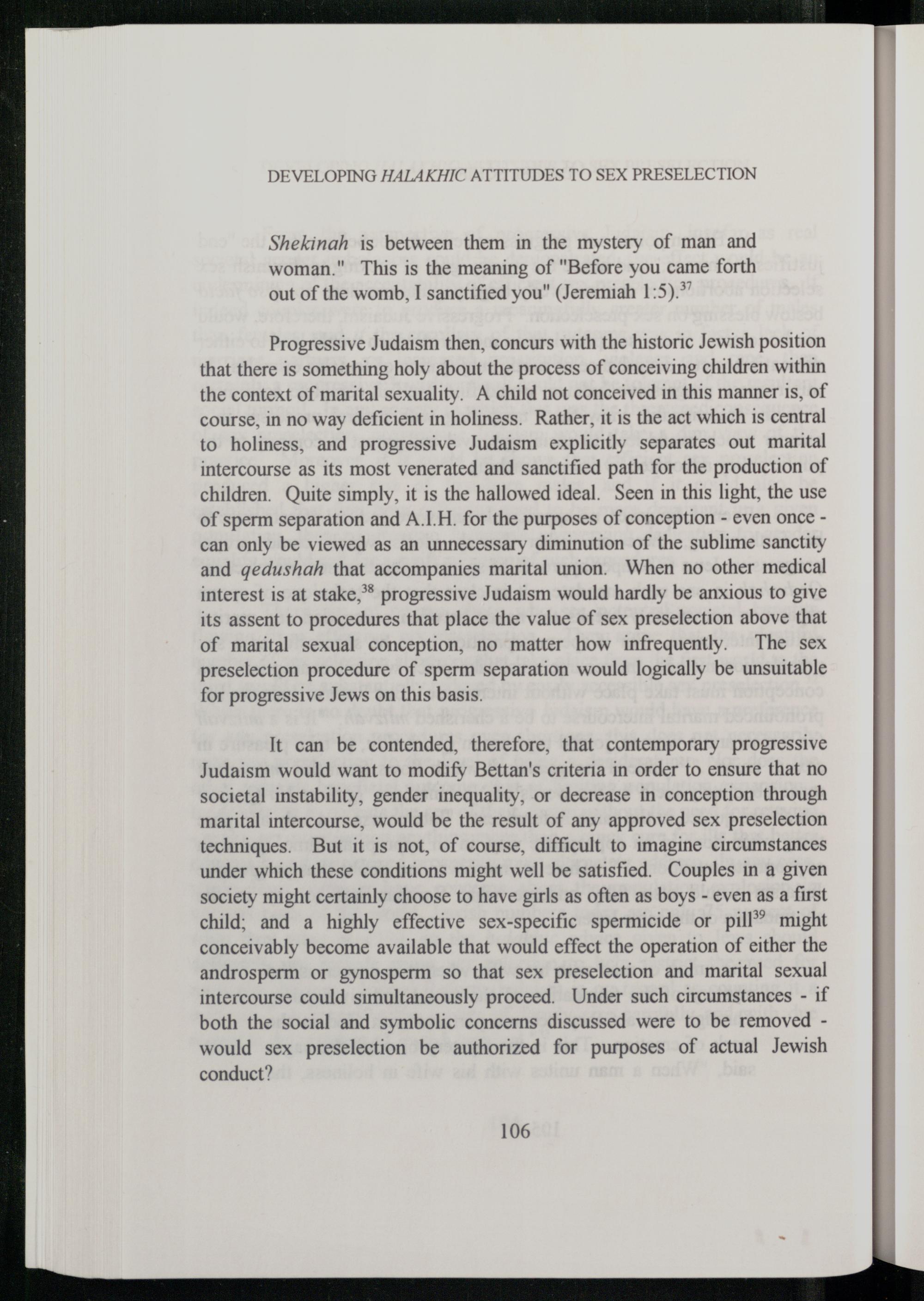 It can be contended, therefore, that contemporary progressive Judaism would want to modify Bettan 's criteria in order to ensure that no societal instability, gender inequality, or decrease in conception through marital intercourse, would be the result of any approved sex preselection techniques. But it is not, of course, difficult to imagine circumstances under which these conditions might well be satisfied. Couples in a given society might certainly choose to have girls as often as boys- even as a first child; and a highly effective sex-specific spermicide or pill” might conceivably become available that would effect the operation of either the androsperm or gynosperm so that sex preselection and marital sexual intercourse could simultaneously proceed. Under such circumstances- if both the social and symbolic concerns discussed were to be removed would sex preselection be authorized for purposes of actual Jewish conduct?