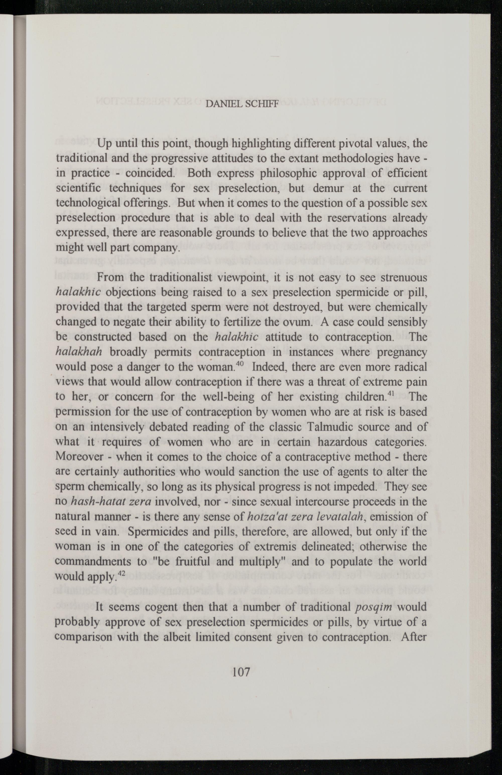 From the traditionalist viewpoint, it is not easy to see strenuous halakhic objections being raised to a sex preselection spermicide or pill, provided that the targeted sperm were not destroyed, but were chemically changed to negate their ability to fertilize the ovum. A case could sensibly be constructed based on the halakhic attitude to contraception. The halakhah broadly permits contraception in instances where pregnancy would pose a danger to the woman.* Indeed, there are even more radical views that would allow contraception if there was a threat of extreme pain to her, or concern for the well-being of her existing children.” The permission for the use of contraception by women who are at risk is based on an intensively debated reading of the classic Talmudic source and of what it requires of women who are in certain hazardous categories. Moreover- when it comes to the choice of a contraceptive method- there are certainly authorities who would sanction the use of agents to alter the sperm chemically, so long as its physical progress is not impeded. They see no hash-hatat zera involved, nor- since sexual intercourse proceeds in the natural manner- is there any sense of hotza'at zera levatalah, emission of seed in vain. Spermicides and pills, therefore, are allowed, but only if the woman is in one of the categories of extremis delineated; otherwise the commandments to"be fruitful and multiply" and to populate the world would apply.*
