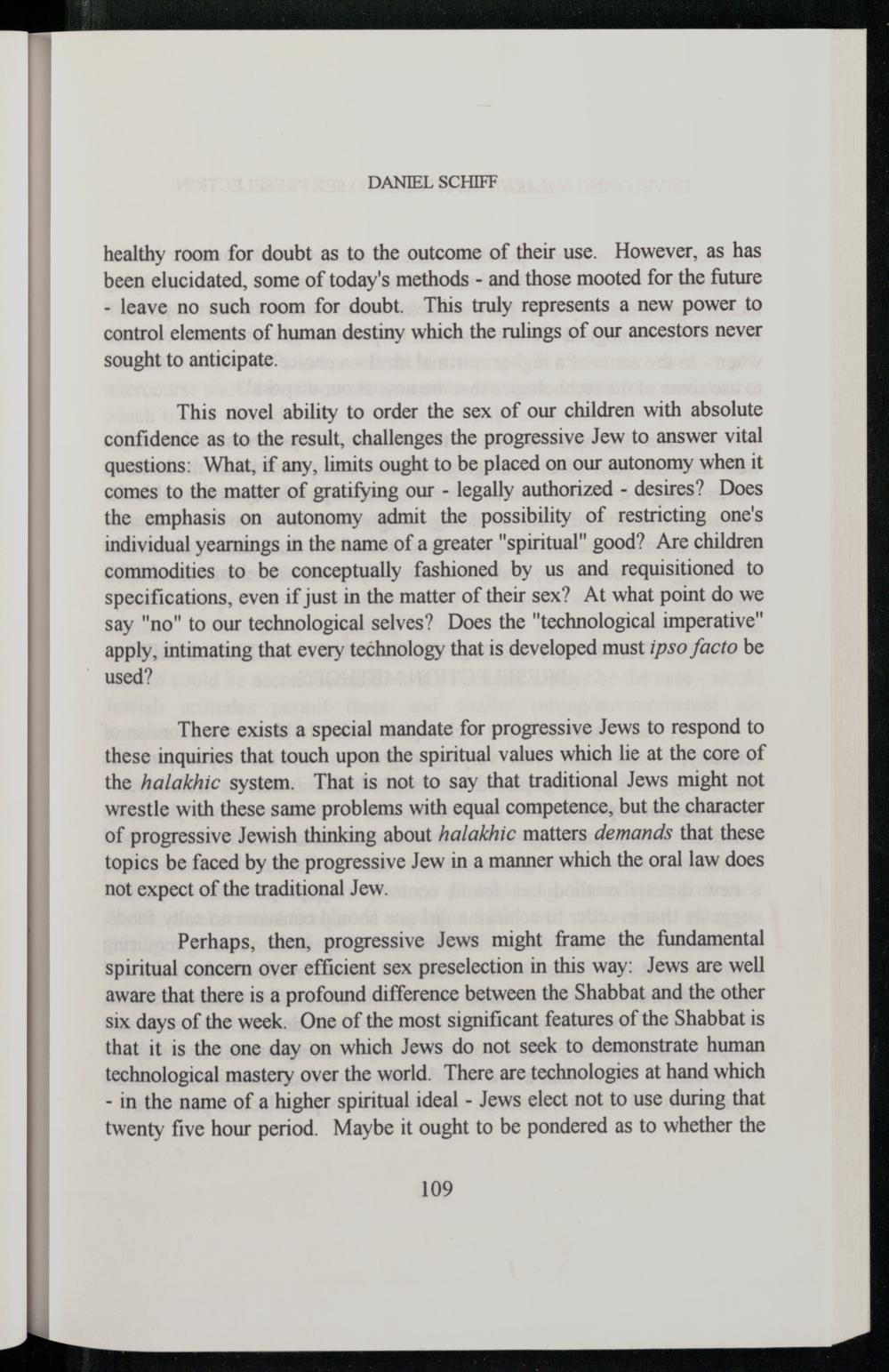 This novel ability to order the sex of our children with absolute confidence as to the result, challenges the progressive Jew to answer vital questions: What, if any, limits ought to be placed on our autonomy when it comes to the matter of gratifying our- legally authorized- desires? Does the emphasis on autonomy admit the possibility of restricting one's individual yearnings in the name of a greater"spiritual" good? Are children commodities to be conceptually fashioned by us and requisitioned to specifications, even if just in the matter of their sex? At what point do we say"no" to our technological selves? Does the"technological imperative" apply, intimating that every technology that is developed must ipso facto be used?