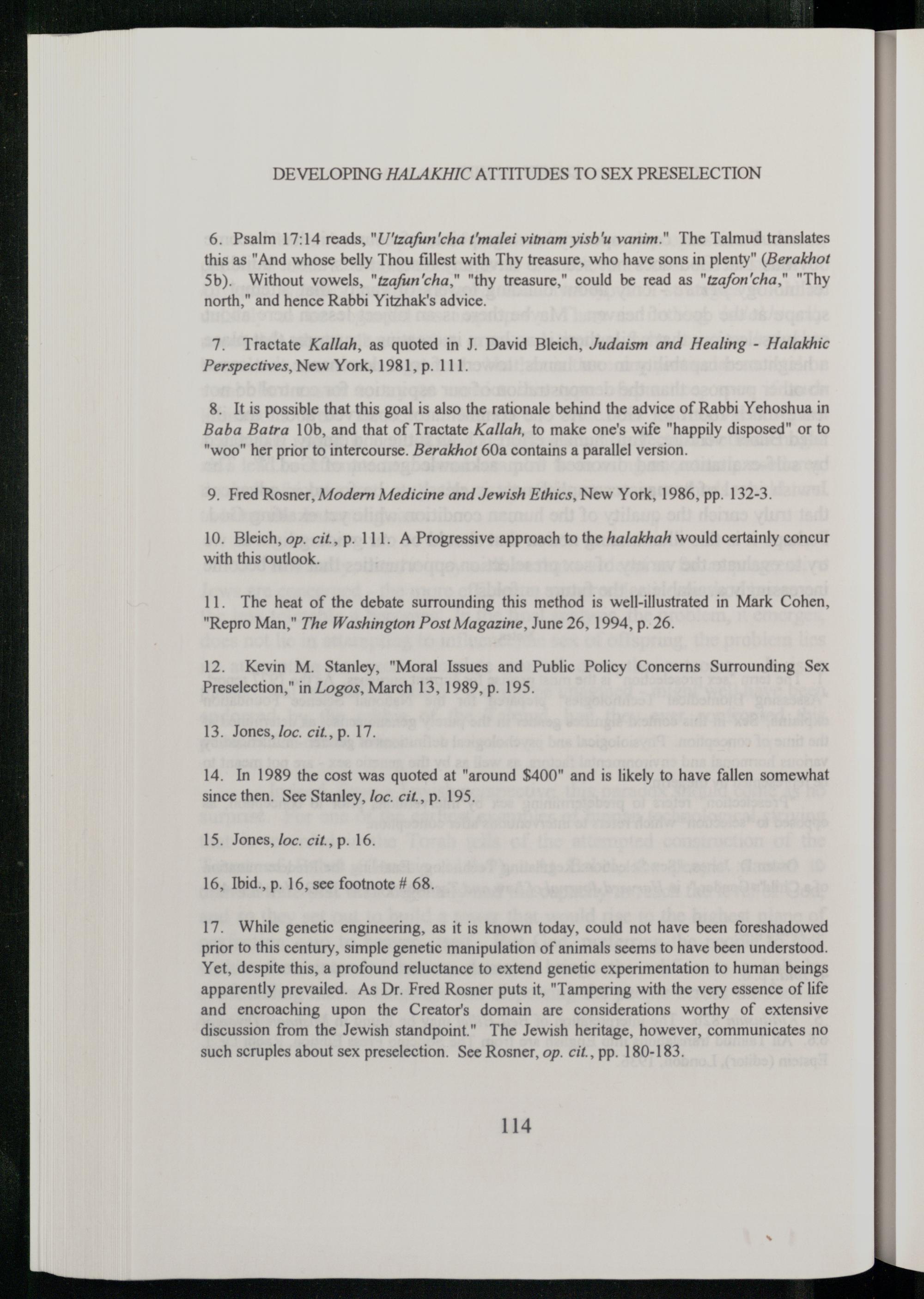 17. While genetic engineering, as it is known today, could not have been foreshadowed prior to this century, simple genetic manipulation of animals seems to have been understood. Yet, despite this, a profound reluctance to extend genetic experimentation to human beings apparently prevailed. As Dr. Fred Rosner puts it,"Tampering with the very essence of life and encroaching upon the Creator's domain are considerations worthy of extensive discussion from the Jewish standpoint." The Jewish heritage, however, communicates no such scruples about sex preselection. See Rosner , op. cit., pp. 180-183.