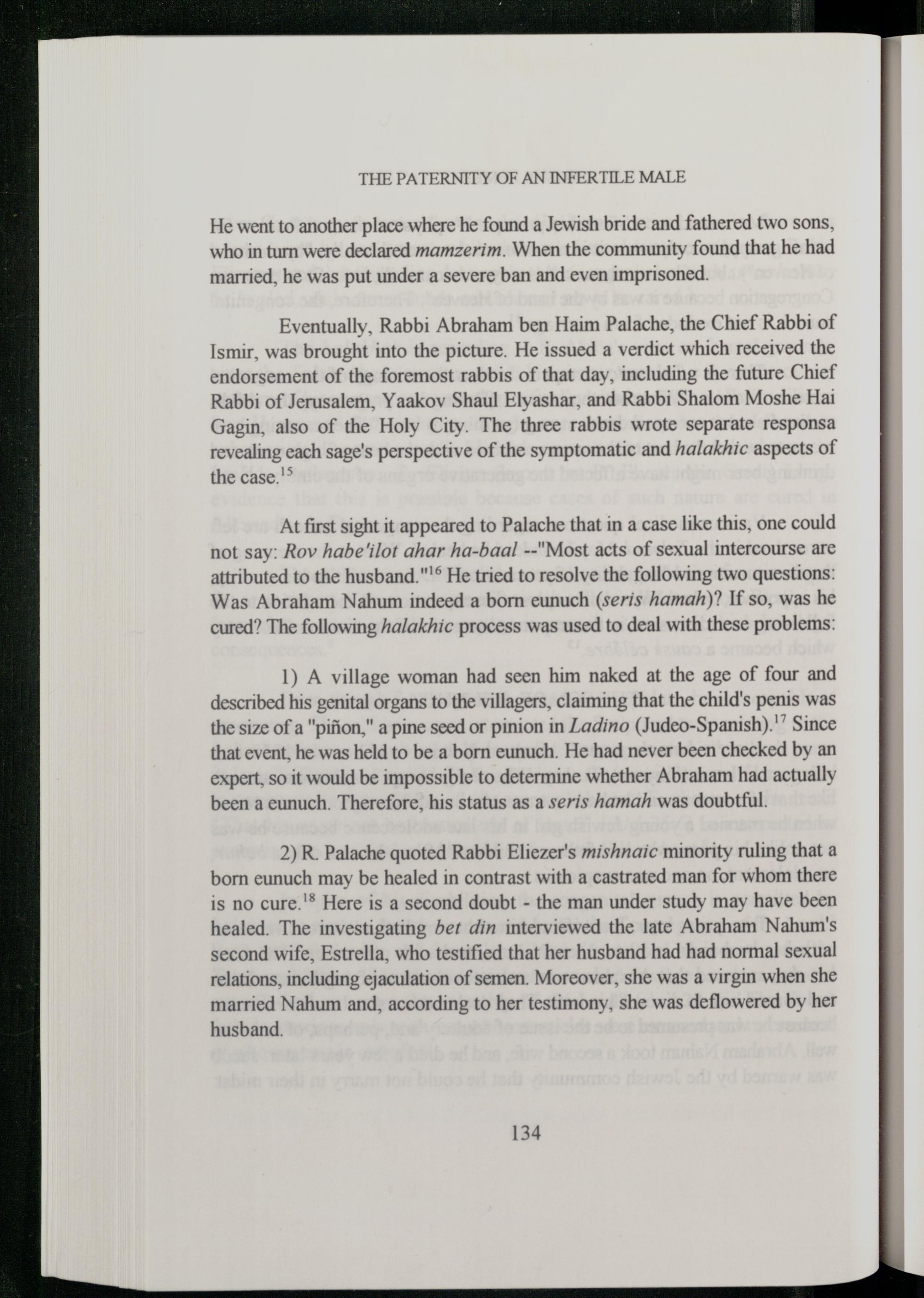 2) R. Palache quoted Rabbi Eliezer 's mishnaic minority ruling that a born eunuch may be healed in contrast with a castrated man for whom there is no cure.'® Here is a second doubt- the man under study may have been healed. The investigating bet din interviewed the late Abraham Nahum's second wife, Estrella, who testified that her husband had had normal sexual relations, including ejaculation of semen. Moreover, she was a virgin when she married Nahum and, according to her testimony, she was deflowered by her husband.