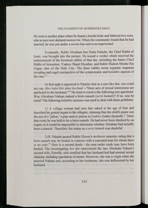 At first sight it appeared to Palache that in a case like this, one could not say: Rov habe'ilot ahar ha-baal--"Most acts of sexual intercourse are attributed to the husband."'® He tried to resolve the following two questions: Was Abraham Nahum indeed a born eunuch(seris hamah)? If so, was he cured? The following halakhic process was used to deal with these problems: