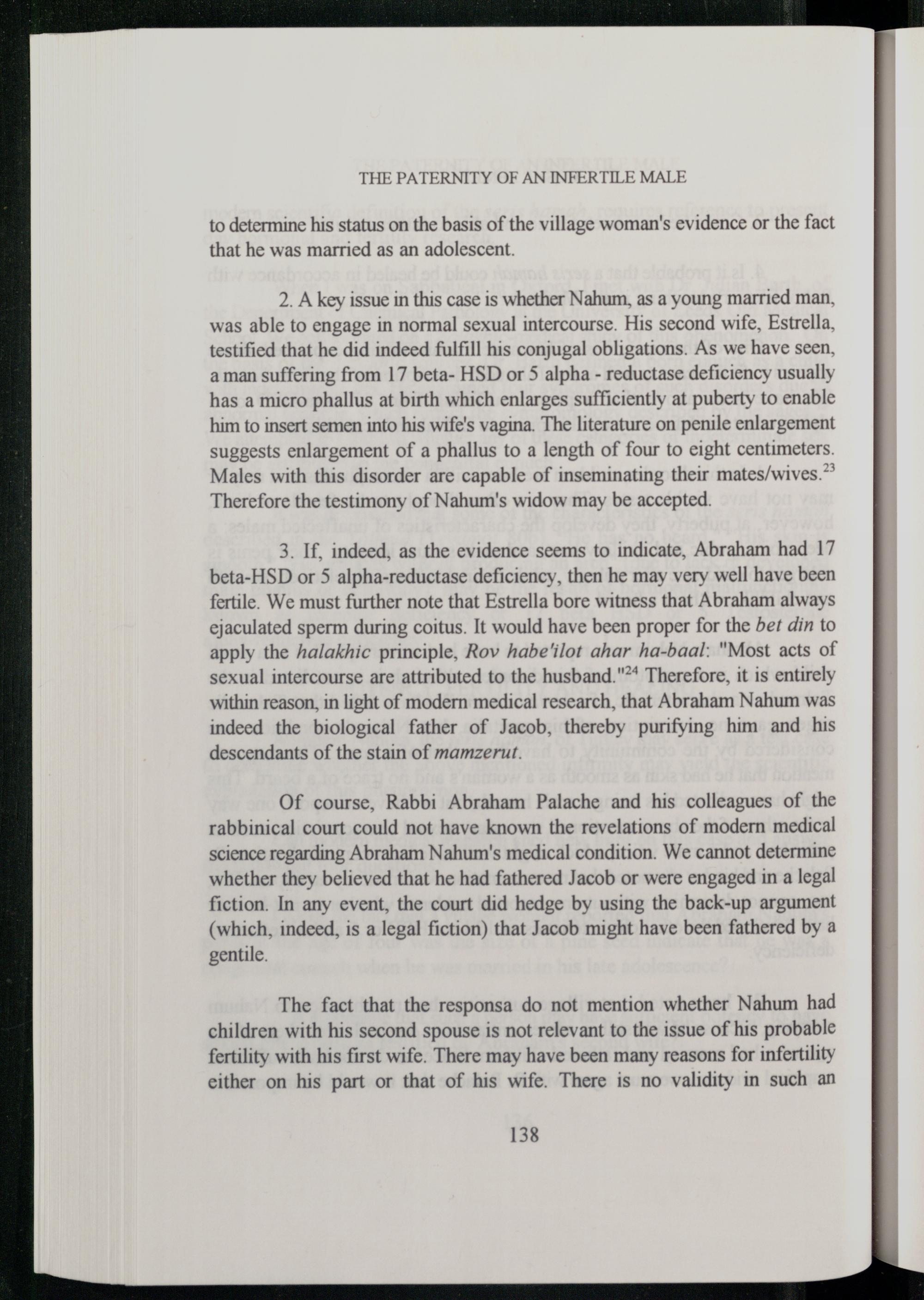 3. If, indeed, as the evidence seems to indicate, Abraham had 17 beta-HSD or 5 alpha-reductase deficiency, then he may very well have been fertile. We must further note that Estrella bore witness that Abraham always ejaculated sperm during coitus. It would have been proper for the bet din to apply the halakhic principle, Rov habe'ilot ahar ha-baal:"Most acts of sexual intercourse are attributed to the husband."** Therefore, it is entirely within reason, in light of modern medical research, that Abraham Nahum was indeed the biological father of Jacob, thereby purifying him and his descendants of the stain of mamzerut.