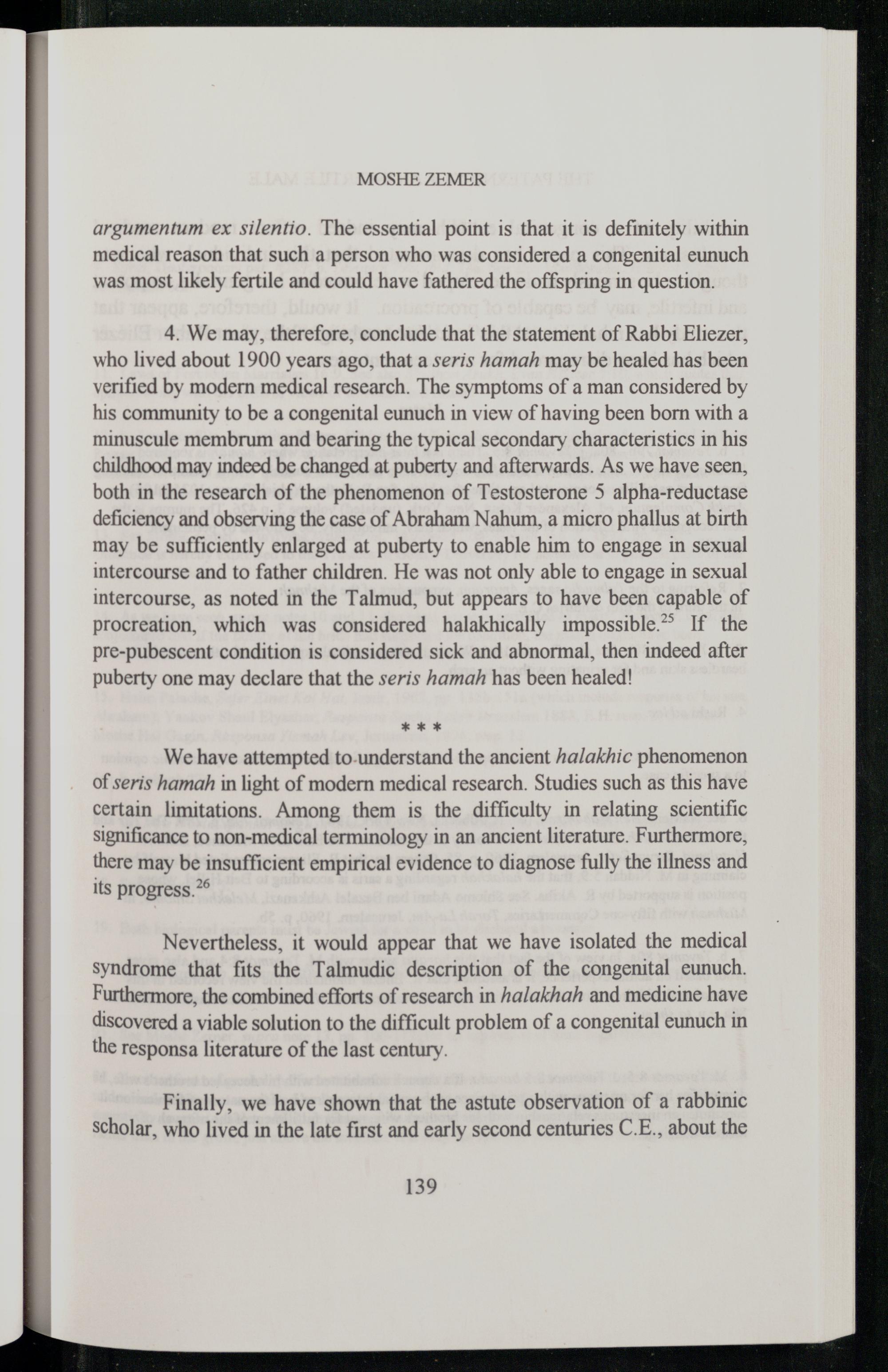 4. We may, therefore, conclude that the statement of Rabbi Eliezer , who lived about 1900 years ago, that a seris hamah may be healed has been verified by modern medical research. The symptoms of a man considered by his community to be a congenital eunuch in view of having been born with a minuscule membrum and bearing the typical secondary characteristics in his childhood may indeed be changed at puberty and afterwards. As we have seen, both in the research of the phenomenon of Testosterone 5 alpha-reductase deficiency and observing the case of Abraham Nahum, a micro phallus at birth may be sufficiently enlarged at puberty to enable him to engage in sexual intercourse and to father children. He was not only able to engage in sexual intercourse, as noted in the Talmud , but appears to have been capable of procreation, which was considered halakhically impossible.” If the pre-pubescent condition is considered sick and abnormal, then indeed after puberty one may declare that the seris hamah has been healed!
