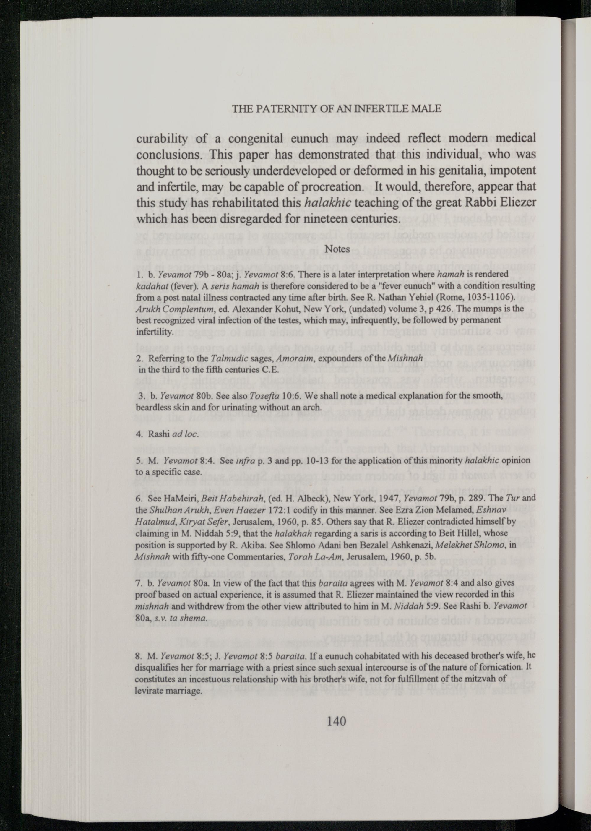 curability of a congenital eunuch may indeed reflect modern medical conclusions. This paper has demonstrated that this individual, who was thought to be seriously underdeveloped or deformed in his genitalia, impotent and infertile, may be capable of procreation. It would, therefore, appear that this study has rehabilitated this halakhic teaching of the great Rabbi Eliezer which has been disregarded for nineteen centuries.