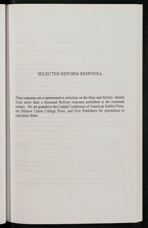 These responsa are a representative selection on the fetus and fertility chosen from more than a thousand Reform responsa published in the twentieth century. We are grateful to the Central Conference of American Rabbis Press, the Hebrew Union College Press, and Dvir Publishers for permission to