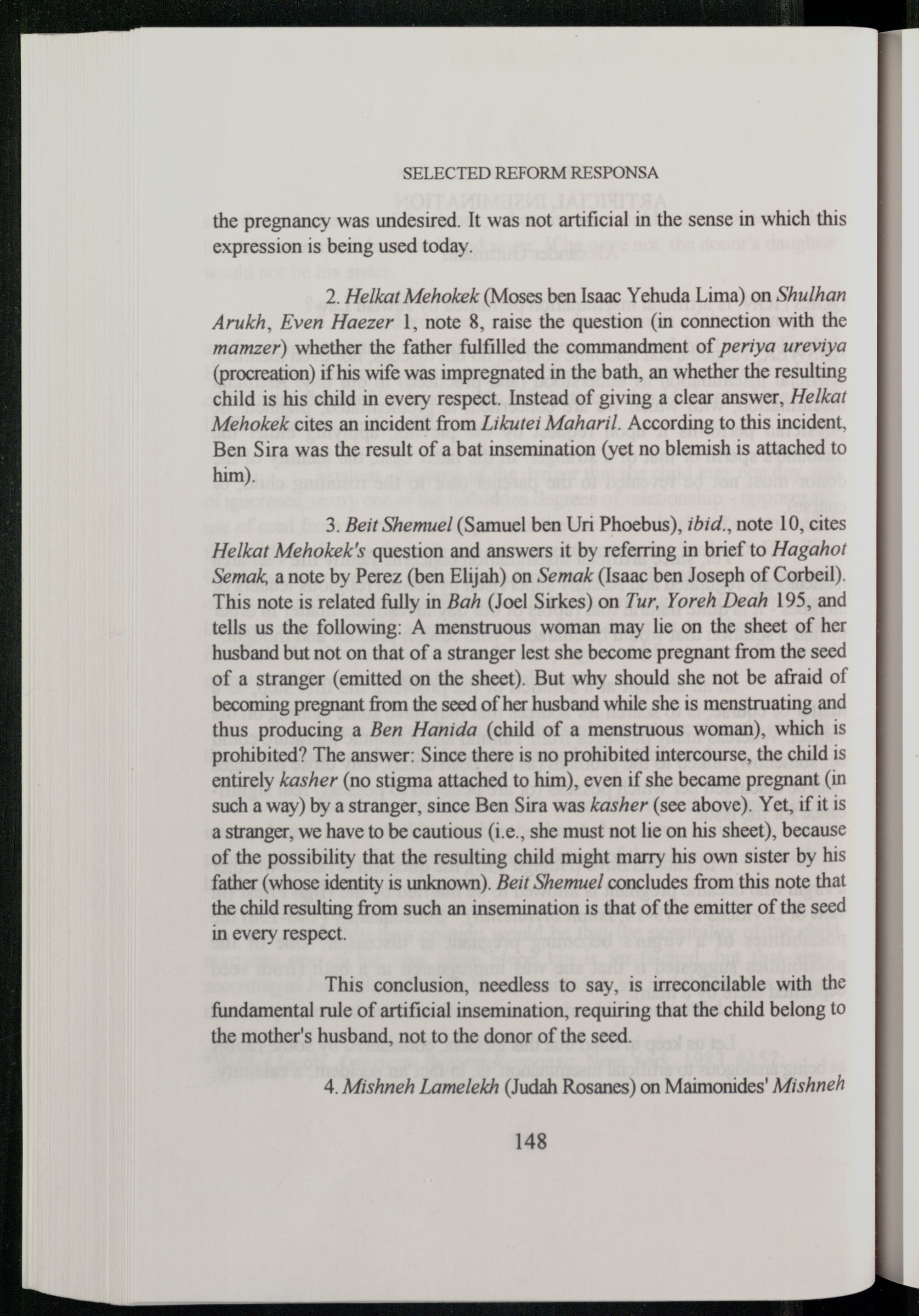 3. Beit Shemuel(Samuel ben Uri Phoebus), ibid., note 10, cites Helkat Mehokek's question and answers it by referring in brief to Hagahot Semak, a note by Perez (ben Elijah) on Semak(Isaac ben Joseph of Corbeil ). This note is related fully in Bah(Joel Sirkes ) on Tur, Yoreh Deah 195, and tells us the following: A menstruous woman may lic on the sheet of her husband but not on that of a stranger lest she become pregnant from the seed of a stranger(emitted on the sheet). But why should she not be afraid of becoming pregnant from the seed of her husband while she is menstruating and thus producing a Ben Hanida(child of a menstruous woman), which is prohibited? The answer: Since there is no prohibited intercourse, the child is entirely kasher(no stigma attached to him), even if she became pregnant(in such a way) by a stranger, since Ben Sira was kasher (see above). Yet, if it is a stranger, we have to be cautious(i.e., she must not lie on his sheet), because of the possibility that the resulting child might marry his own sister by his father(whose identity is unknown). Beit Shemuel concludes from this note that the child resulting from such an insemination is that of the emitter of the seed in every respect.
