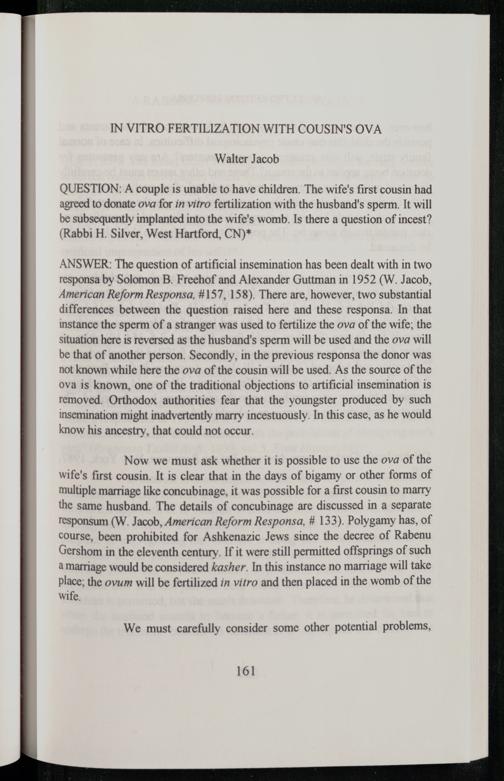 ANSWER: The question of artificial insemination has been dealt with in two responsa by Solomon B. Freehof and Alexander Guttman in 1952(W. Jacob, American Reform Responsa,#157, 158). There are, however, two substantial differences between the question raised here and these responsa. In that instance the sperm of a stranger was used to fertilize the ova of the wife; the situation here is reversed as the husband's sperm will be used and the ova will be that of another person. Secondly, in the previous responsa the donor was not known while here the ova of the cousin will be used. As the source of the ova is known, one of the traditional objections to artificial insemination is removed. Orthodox authorities fear that the youngster produced by such insemination might inadvertently marry incestuously. In this case, as he would know his ancestry, that could not occur.