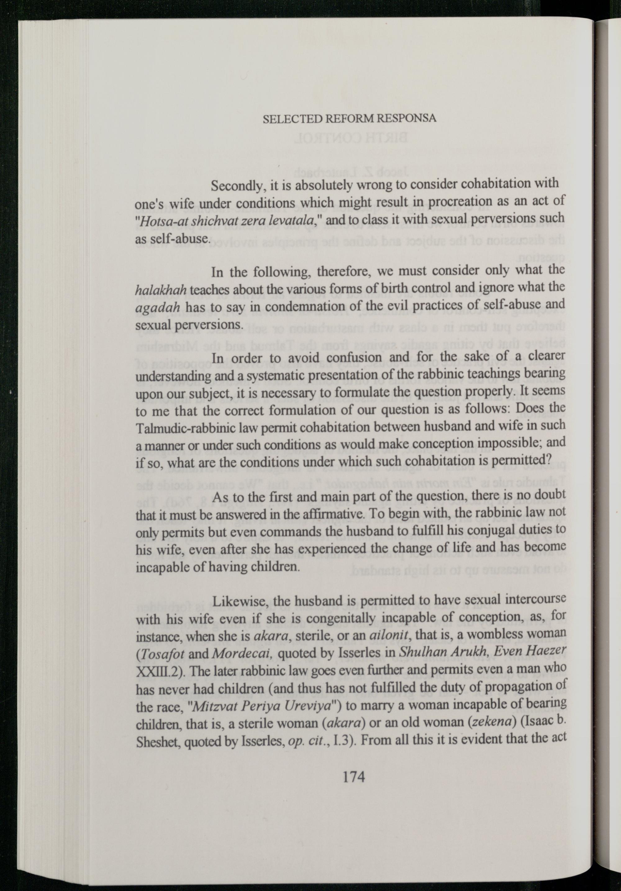 In the following, therefore, we must consider only what the halakhah teaches about the various forms of birth control and ignore what the agadah has to say in condemnation of the evil practices of self-abuse and sexual perversions.