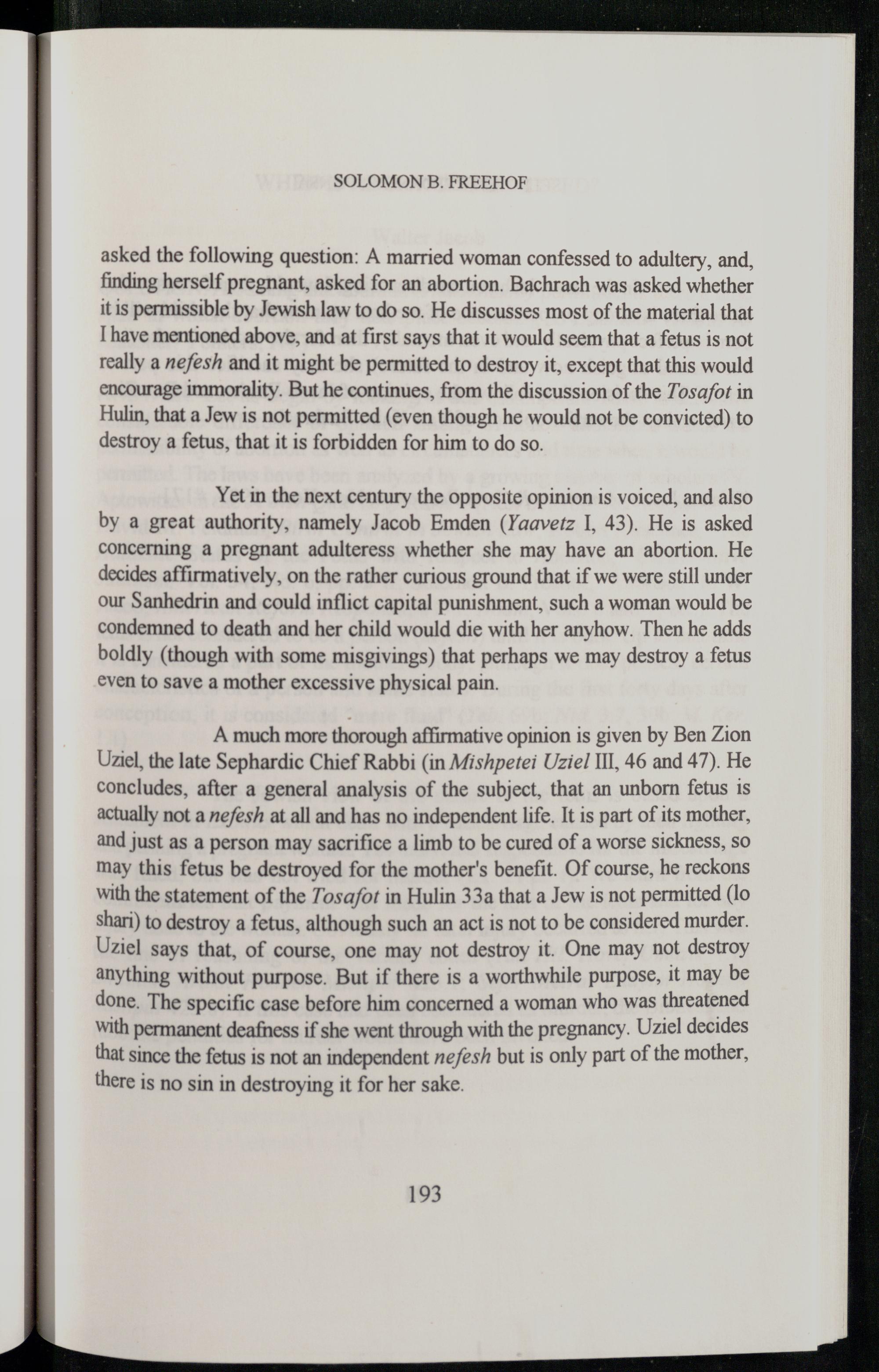 asked the following question: A married woman confessed to adultery, and, finding herself pregnant, asked for an abortion. Bachrach was asked whether it is permissible by Jewish law to do so. He discusses most of the material that [ have mentioned above, and at first says that it would seem that a fetus is not really a nefesh and it might be permitted to destroy it, except that this would encourage immorality. But he continues, from the discussion of the Tosafot in Hulin, that a Jew is not permitted(even though he would not be convicted) to destroy a fetus, that it is forbidden for him to do so.