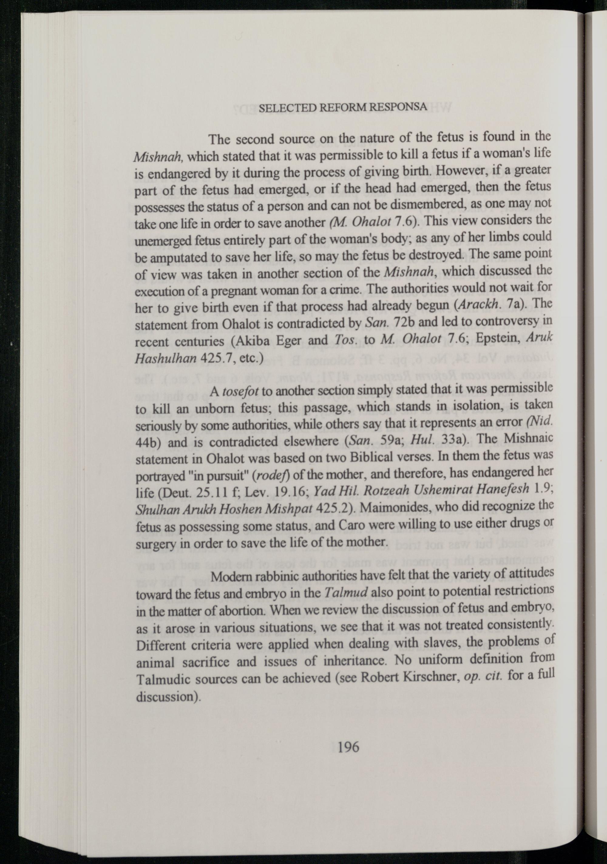 Modern rabbinic authorities have felt that the variety of attitudes toward the fetus and embryo in the 7almud also point to potential restrictions in the matter of abortion. When we review the discussion of fetus and embryo, as it arose in various situations, we see that it was not treated consistently. Different criteria were applied when dealing with slaves, the problems of animal sacrifice and issues of inheritance. No uniform definition from Talmudic sources can be achieved(see Robert Kirschner, op. cit. for a full discussion).