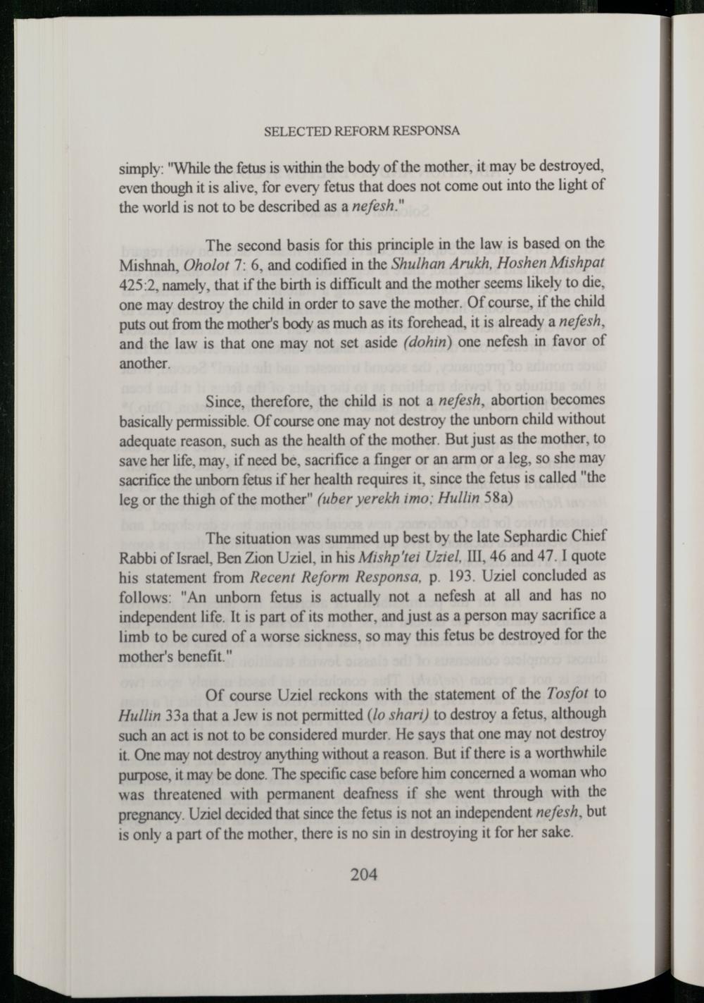 The situation was summed up best by the late Sephardic Chief Rabbi of Israel, Ben Zion Uziel , in his Mishp'tei Uziel, 111, 46 and 47. I quote his statement from Recent Reform Responsa, p. 193. Uziel concluded as follows:"An unborn fetus is actually not a nefesh at all and has no independent life. It is part of its mother, and just as a person may sacrifice a limb to be cured of a worse sickness, so may this fetus be destroyed for the mother's benefit."