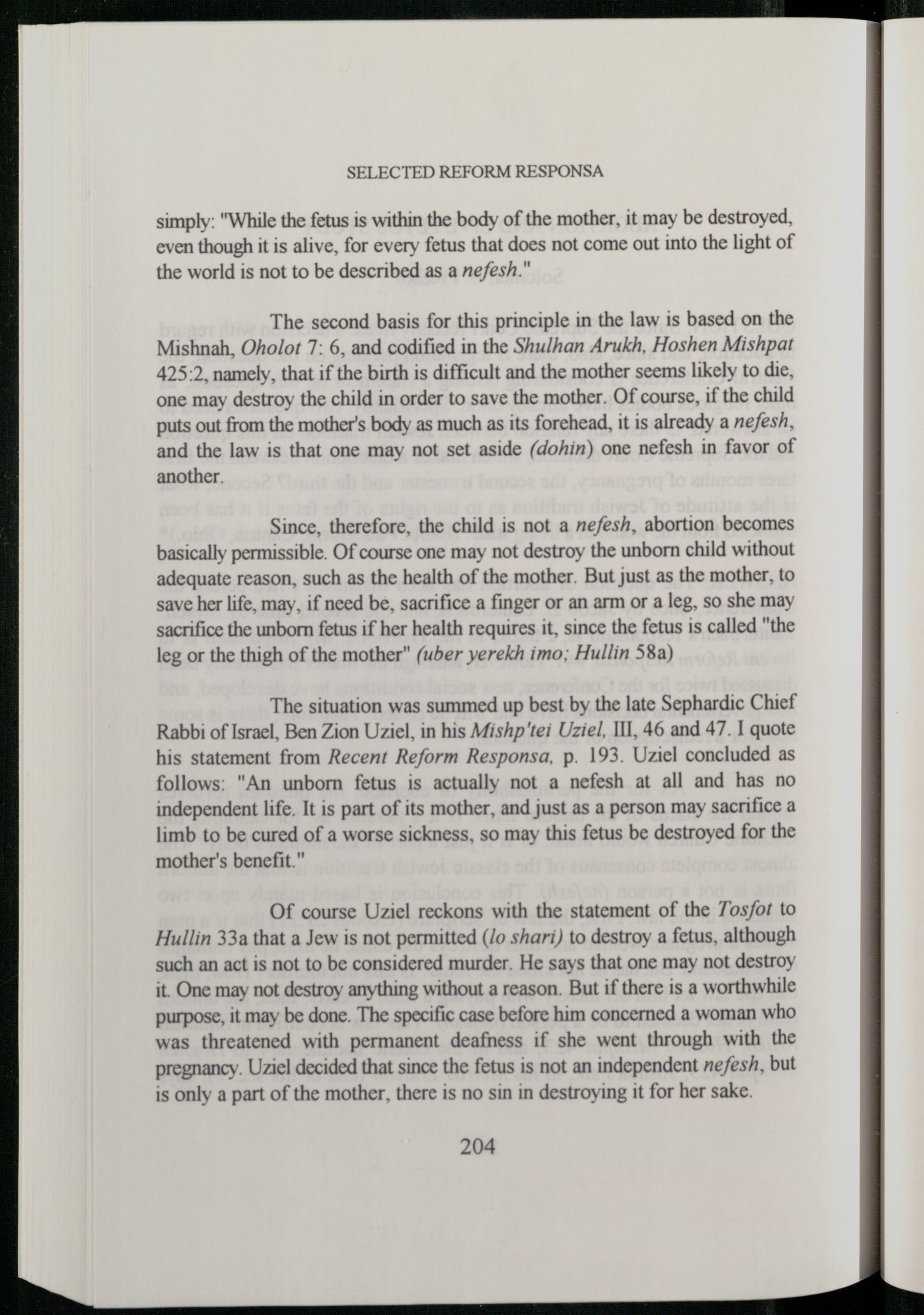 Of course Uziel reckons with the statement of the 7osfot to Hullin 33a that a Jew is not permitted(lo shari) to destroy a fetus, although such an act is not to be considered murder. He says that one may not destroy it. One may not destroy anything without a reason. But if there is a worthwhile purpose, it may be done. The specific case before him concerned a woman who was threatened with permanent deafness if she went through with the pregnancy. Uziel decided that since the fetus is not an independent nefesh, but is only a part of the mother, there is no sin in destroying it for her sake.