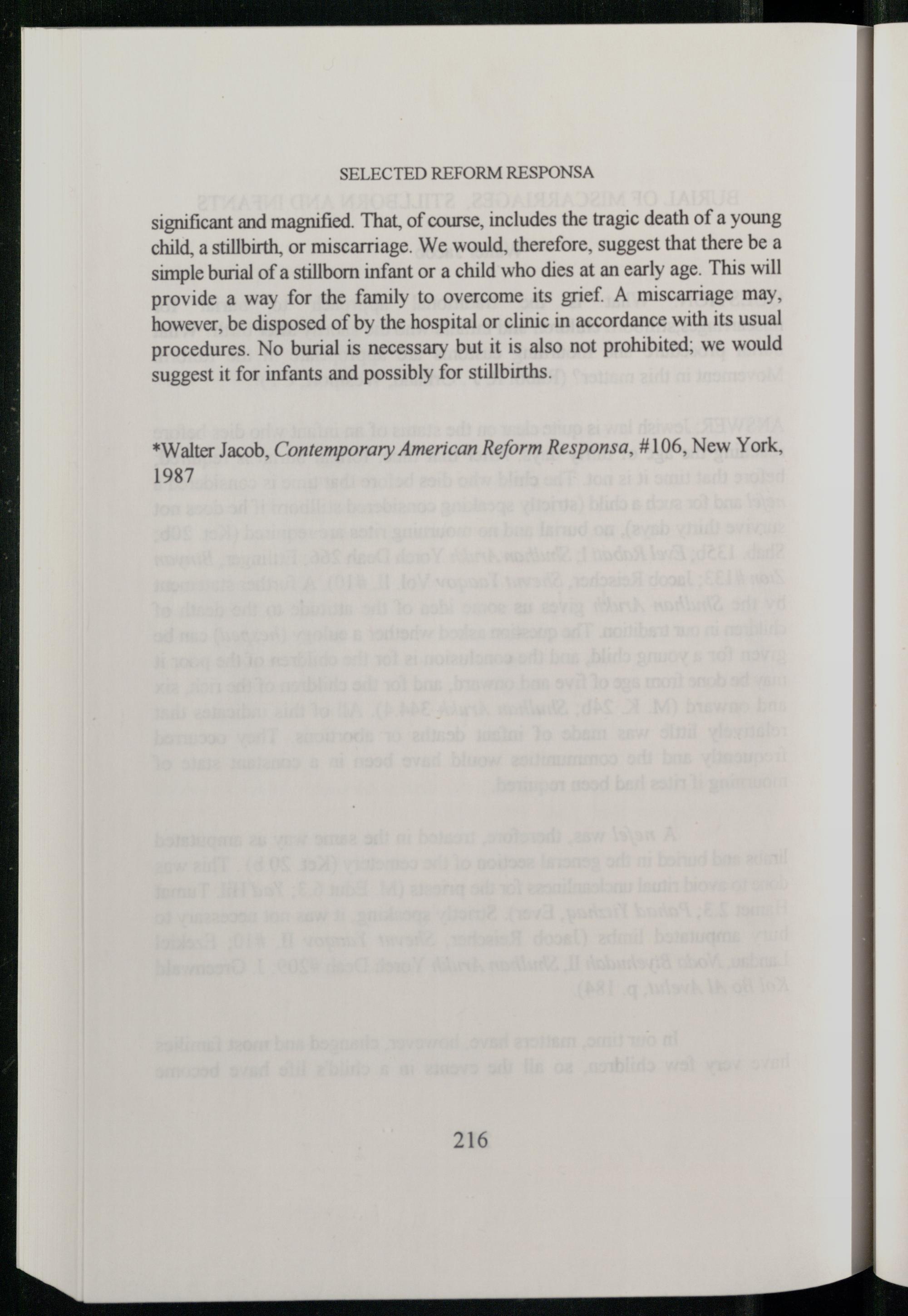 significant and magnified. That, of course, includes the tragic death of a young child, a stillbirth, or miscarriage. We would, therefore, suggest that there be a simple burial of a stillborn infant or a child who dies at an early age. This will provide a way for the family to overcome its grief. A miscarriage may, however, be disposed of by the hospital or clinic in accordance with its usual procedures. No burial is necessary but it is also not prohibited; we would suggest it for infants and possibly for stillbirths.