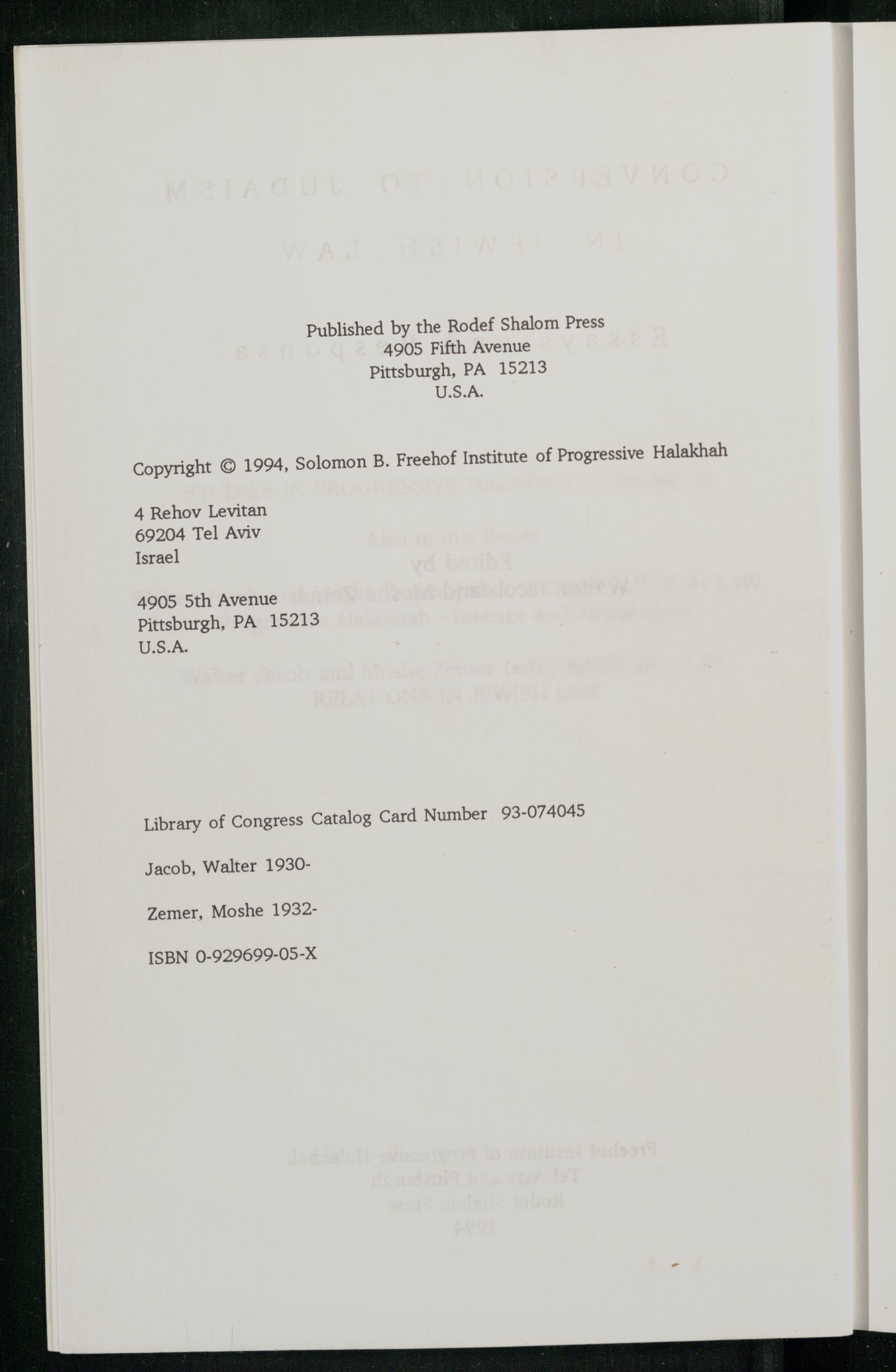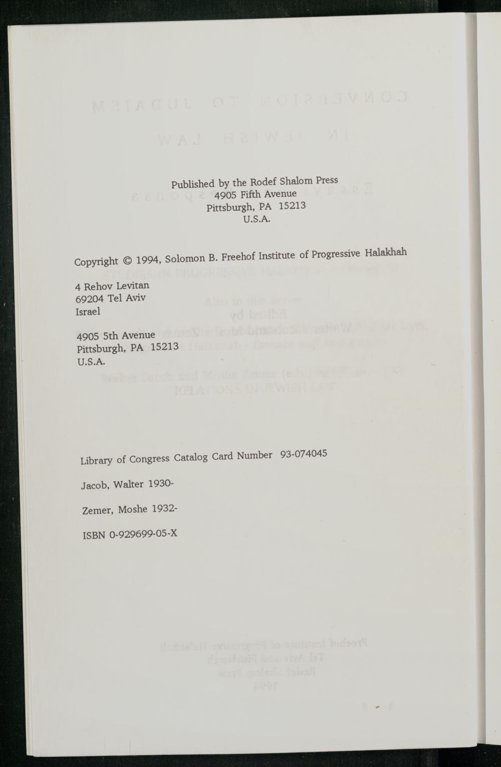 Library of Congress Catalog Card Number 93-074045 Jacob, Walter 1930Zemer, Moshe 1932