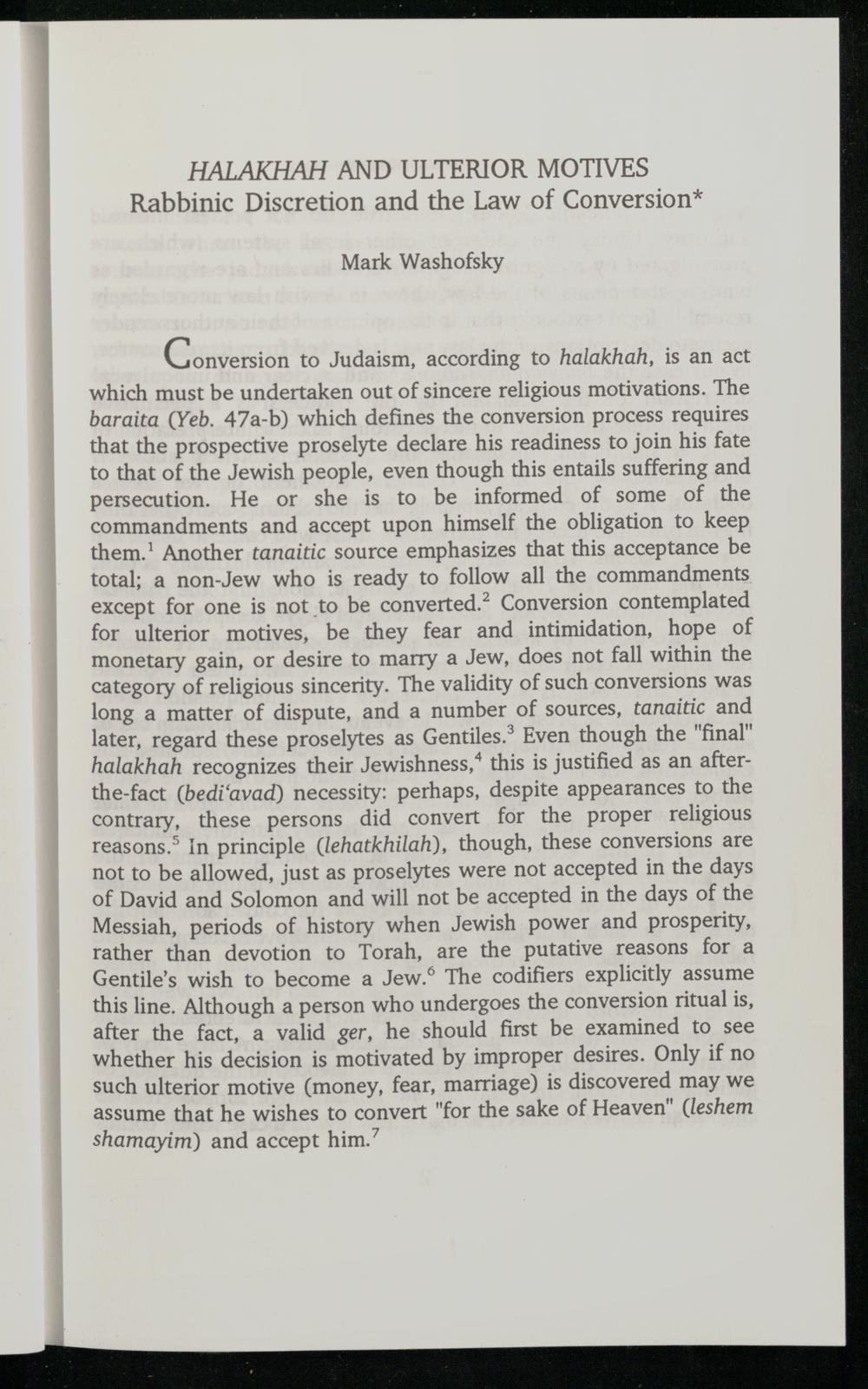 which must be undertaken out of sincere religious motivations. The baraita(Yeb. 47a-b) which defines the conversion process requires that the prospective proselyte declare his readiness to join his fate to that of the Jewish people, even though this entails suffering and persecution. He or she is to be informed of some of the commandments and accept upon himself the obligation to keep them.! Another tanaitic source emphasizes that this acceptance be total; a non-Jew who is ready to follow all the commandments except for one is not to be converted.” Conversion contemplated for ulterior motives, be they fear and intimidation, hope of monetary gain, or desire to marry a Jew , does not fall within the category of religious sincerity. The validity of such conversions was long a matter of dispute, and a number of sources, tanaitic and later, regard these proselytes as Gentiles.” Even though the"final" halakhah recognizes their Jewishness,* this is justified as an afterthe-fact(bedi‘avad) necessity: perhaps, despite appearances to the contrary, these persons did convert for the proper religious reasons.’ In principle(lehatkhilah), though, these conversions are not to be allowed, just as proselytes were not accepted in the days of David and Solomon and will not be accepted in the days of the Messiah, periods of history when Jewish power and prosperity, rather than devotion to Torah , are the putative reasons for a Gentile’s wish to become a Jew.’ The codifiers explicitly assume this line. Although a person who undergoes the conversion ritual is, after the fact, a valid ger, he should first be examined to see whether his decision is motivated by improper desires. Only if no such ulterior motive(money, fear, marriage) is discovered may we assume that he wishes to convert"for the sake of Heaven"(leshem shamayim) and accept him.”