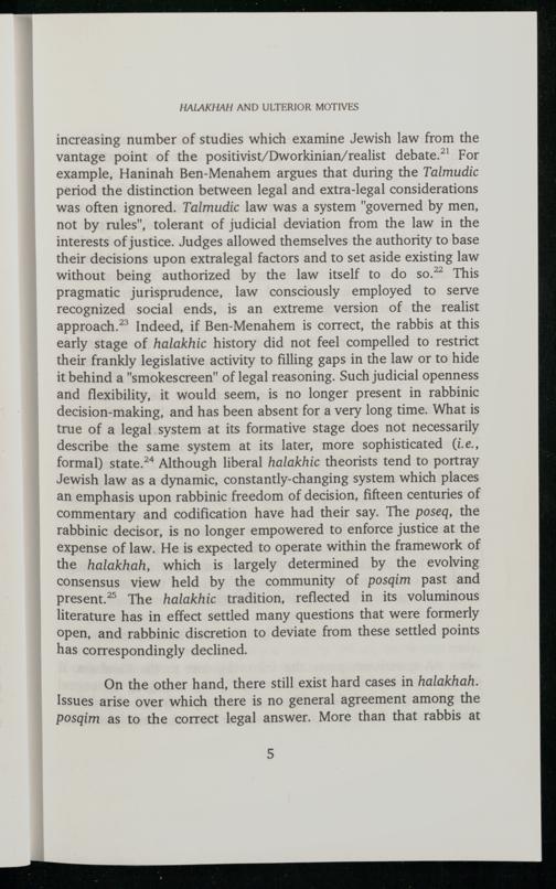 increasing number of studies which examine Jewish law from the vantage point of the positivist/Dworkinian/realist debate.*’ For example, Haninah Ben-Menahem argues that during the Talmudic period the distinction between legal and extra-legal considerations was often ignored. Talmudic law was a system"governed by men, not by rules", tolerant of judicial deviation from the law in the interests of justice. Judges allowed themselves the authority to base their decisions upon extralegal factors and to set aside existing law without being authorized by the law itself to do so.” This pragmatic jurisprudence, law consciously employed to serve recognized social ends, is an extreme version of the realist approach.” Indeed, if Ben-Menahem is correct, the rabbis at this early stage of halakhic history did not feel compelled to restrict their frankly legislative activity to filling gaps in the law or to hide it behind a"smokescreen" of legal reasoning. Such judicial openness and flexibility, it would seem, is no longer present in rabbinic decision-making, and has been absent for a very long time. What is true of a legal system at its formative stage does not necessarily describe the same system at its later, more sophisticated(i.e., formal) state.?* Although liberal halakhic theorists tend to portray Jewish law as a dynamic, constantly-changing system which places an emphasis upon rabbinic freedom of decision, fifteen centuries of commentary and codification have had their say. The poseq, the rabbinic decisor, is no longer empowered to enforce justice at the expense of law. He is expected to operate within the framework of the halakhah, which is largely determined by the evolving consensus view held by the community of posqim past and present.®® The halakhic tradition, reflected in its voluminous literature has in effect settled many questions that were formerly open, and rabbinic discretion to deviate from these settled points has correspondingly declined.