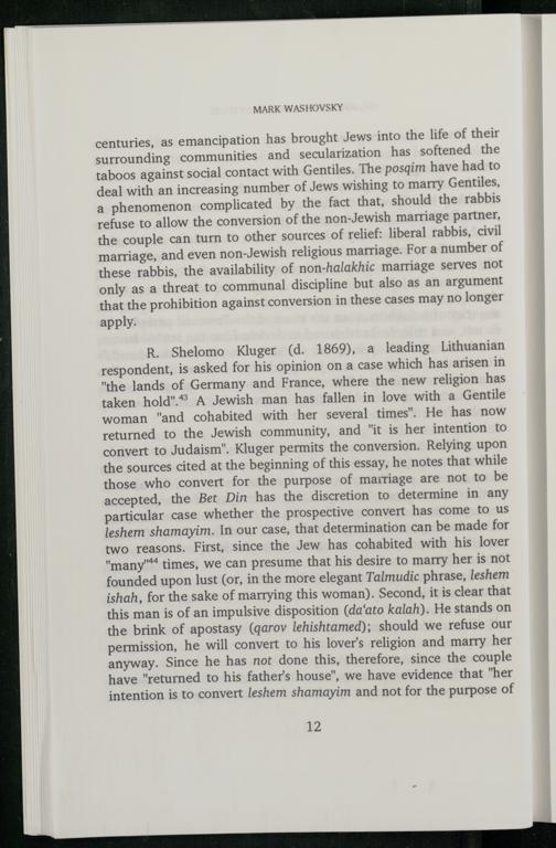 R. Shelomo Kluger(d. 1869), a leading Lithuanian respondent, is asked for his opinion on a case which has arisen in “he lands of Germany and France , where the new religion has taken hold".® A Jewish man has fallen in love with a Gentile woman"and cohabited with her several times". He has now returned to the Jewish community, and"it is her intention to convert to Judaism ". Kluger permits the conversion. Relying upon the sources cited at the beginning of this essay, he notes that while those who convert for the purpose of mairiage are not to be accepted, the Bet Din has the discretion to determine in any particular case whether the prospective convert has come to us leshem shamayim. In our case, that determination can be made for two reasons. First, since the Jew has cohabited with his lover "many"** times, we can presume that his desire to marry her is not founded upon lust(or, in the more elegant Talmudic phrase, leshem ishah, for the sake of marrying this woman). Second, it is clear that this man is of an impulsive disposition(da‘ato kalah). He stands on the brink of apostasy(qarov lehishtamed); should we refuse our permission, he will convert to his lover's religion and marry her anyway. Since he has not done this, therefore, since the couple have"returned to his father's house", we have evidence that"her intention is to convert leshem shamayim and not for the purpose of