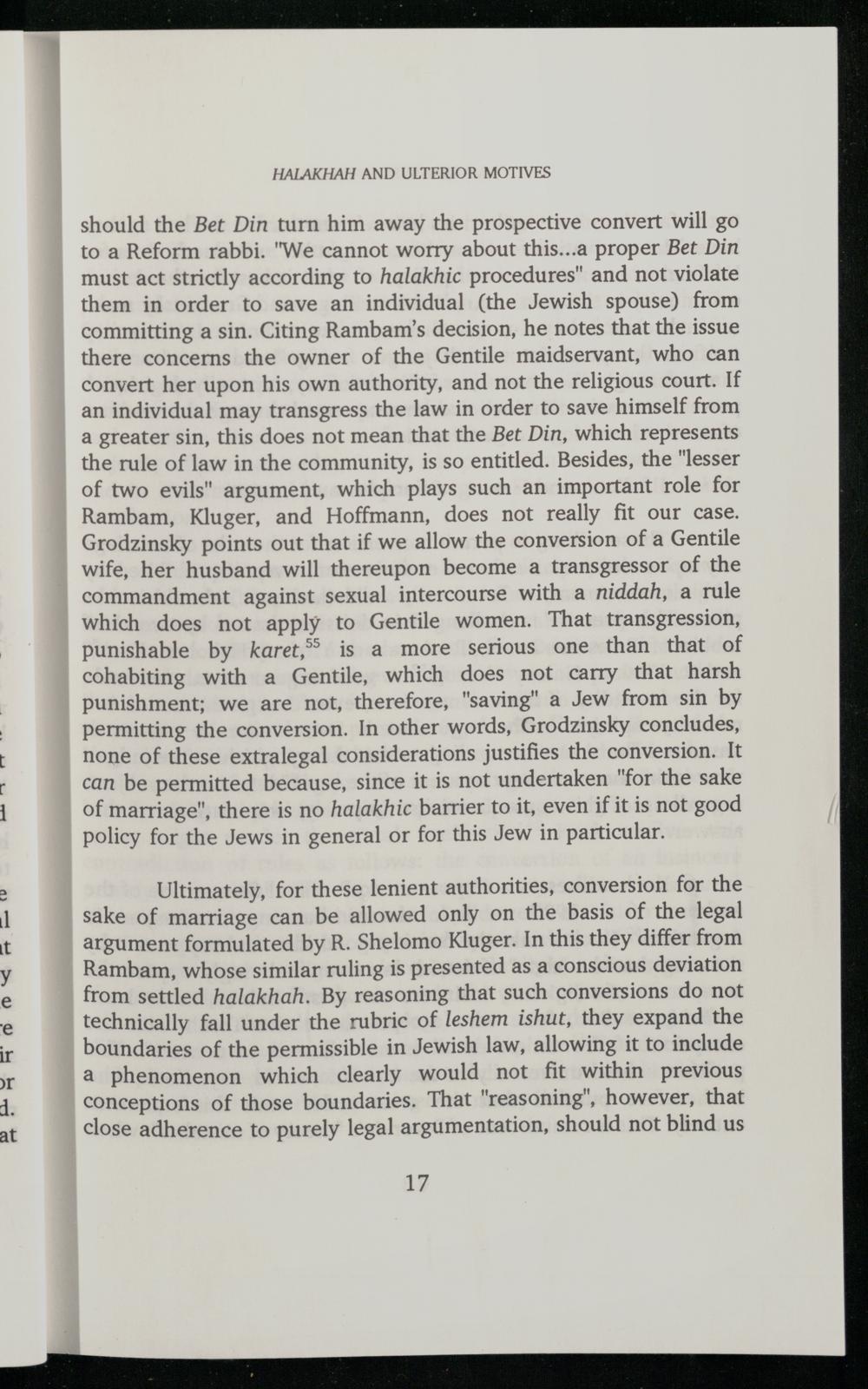 Ultimately, for these lenient authorities, conversion for the sake of marriage can be allowed only on the basis of the legal argument formulated by R. Shelomo Kluger. In this they differ from Rambam , whose similar ruling is presented as a conscious deviation from settled halakhah. By reasoning that such conversions do not technically fall under the rubric of leshem ishut, they expand the boundaries of the permissible in Jewish law, allowing it to include a phenomenon which clearly would not fit within previous conceptions of those boundaries. That"reasoning’, however, that close adherence to purely legal argumentation, should not blind us