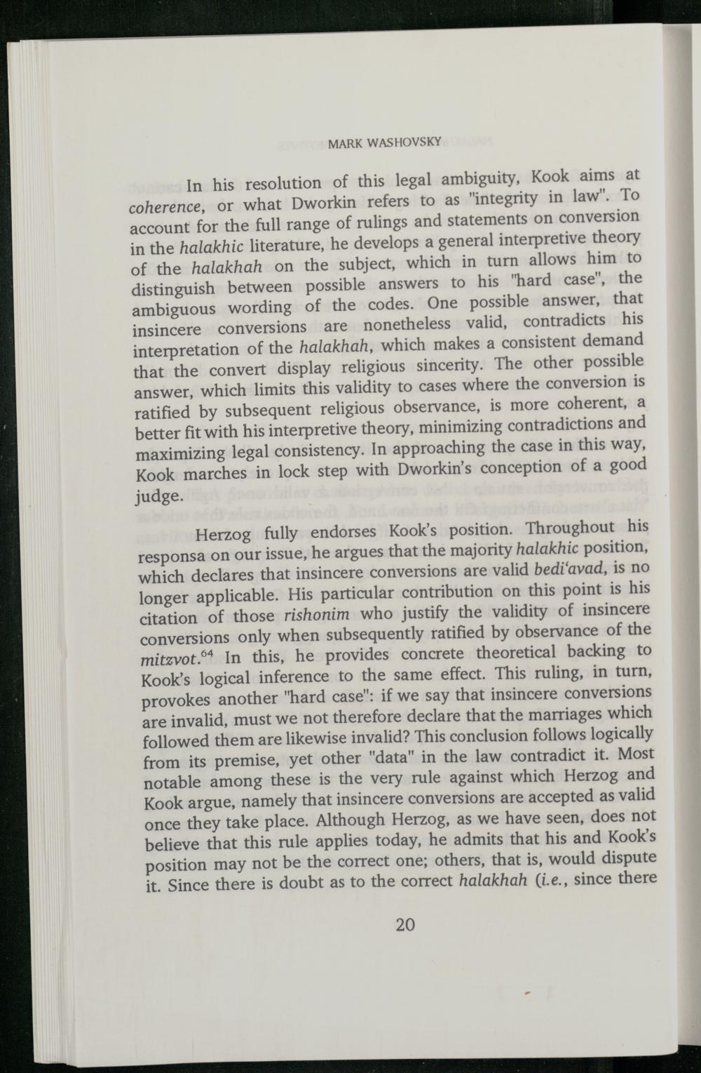 In his resolution of this legal ambiguity, Kook aims at coherence, or what Dworkin refers to as"integrity in law". To account for the full range of rulings and statements on conversion in the halakhic literature, he develops a general interpretive theory of the halakhah on the subject, which in turn allows him to distinguish between possible answers to his"hard case", the ambiguous wording of the codes. One possible answer, that insincere conversions are nonetheless valid, contradicts his interpretation of the halakhah, which makes a consistent demand that the convert display religious sincerity. The other possible answer, which limits this validity to cases where the conversion is ratified by subsequent religious observance, is more coherent, a better fit with his interpretive theory, minimizing contradictions and maximizing legal consistency. In approaching the case in this way, Kook marches in lock step with Dworkin’s conception of a good judge.
