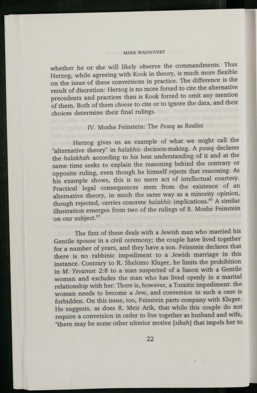 whether he or she will likely observe the commandments. Thus Herzog, while agreeing with Kook in theory, is much more flexible on the issue of these conversions in practice. The difference is the result of discretion: Herzog is no more forced to cite the alternative precedents and practices than is Kook forced to omit any mention of them. Both of them choose to cite or to ignore the data, and their choices determine their final rulings.