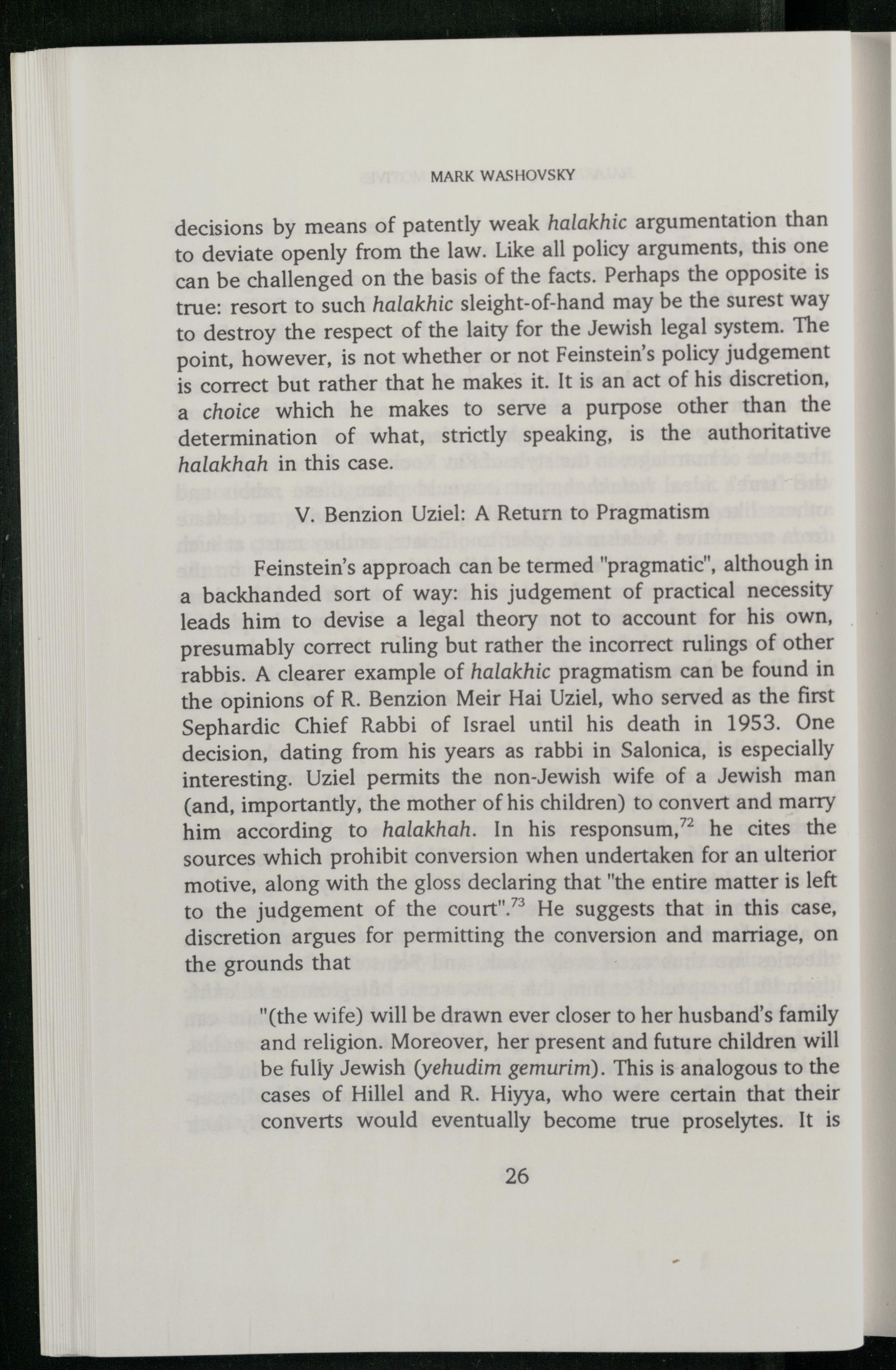 Feinstein’s approach can be termed"pragmatic”, although in a backhanded sort of way: his judgement of practical necessity leads him to devise a legal theory not to account for his own, presumably correct ruling but rather the incorrect rulings of other rabbis. A clearer example of halakhic pragmatism can be found in the opinions of R. Benzion Meir Hai Uziel, who served as the first Sephardic Chief Rabbi of Israel until his death in 1953. One decision, dating from his years as rabbi in Salonica , is especially interesting. Uziel permits the non-Jewish wife of a Jewish man (and, importantly, the mother of his children) to convert and marry him according to halakhah. In his responsum,’”” he cites the sources which prohibit conversion when undertaken for an ulterior motive, along with the gloss declaring that"the entire matter is left to the judgement of the court".”” He suggests that in this case, discretion argues for permitting the conversion and marriage, on the grounds that
