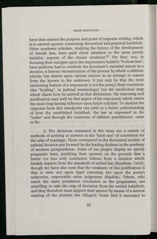 2. The decisions examined in this essay use a variety of methods of arriving at answers to the"hard case" of conversion for the sake of marriage. These correspond to the theoretical models of judicial decision put forward by the leading thinkers in the academy of modern jurisprudence. Some of our posqim display an openly pragmatic bent, justifying their answers on the grounds that a better(or less evil) conclusion follows from a decision which frankly departs from the standards of settled law(Rambam , Uziel), though we have also seen that the weakness of this justification is that it rests not upon legal reasoning but upon the poseq’s subjective, unprovable value judgement(Rashba). Others, who reach the same permissive conclusion as the pragmatists, are unwilling to take the step of deviation from the settled halakhah, and they therefore must support their answer by means of a narrow reading of the positive law(Kluger). Some find it necessary to