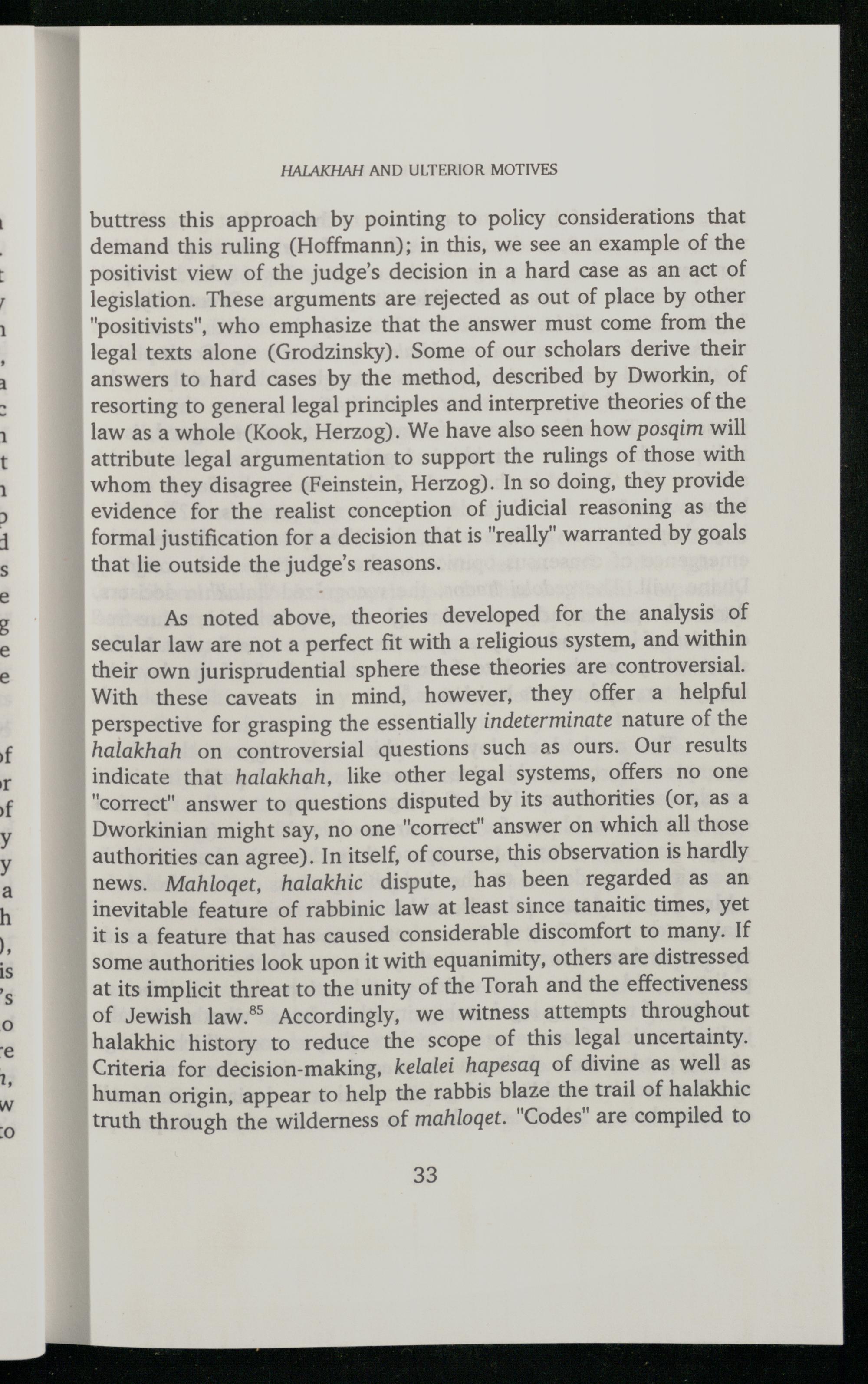 buttress this approach by pointing to policy considerations that demand this ruling(Hoffmann); in this, we see an example of the positivist view of the judge's decision in a hard case as an act of legislation. These arguments are rejected as out of place by other "positivists", who emphasize that the answer must come from the legal texts alone(Grodzinsky). Some of our scholars derive their answers to hard cases by the method, described by Dworkin, of resorting to general legal principles and interpretive theories of the law as a whole(Kook, Herzog). We have also seen how posqim will attribute legal argumentation to support the rulings of those with whom they disagree(Feinstein, Herzog). In so doing, they provide evidence for the realist conception of judicial reasoning as the formal justification for a decision that is"really" warranted by goals that lie outside the judge's reasons.