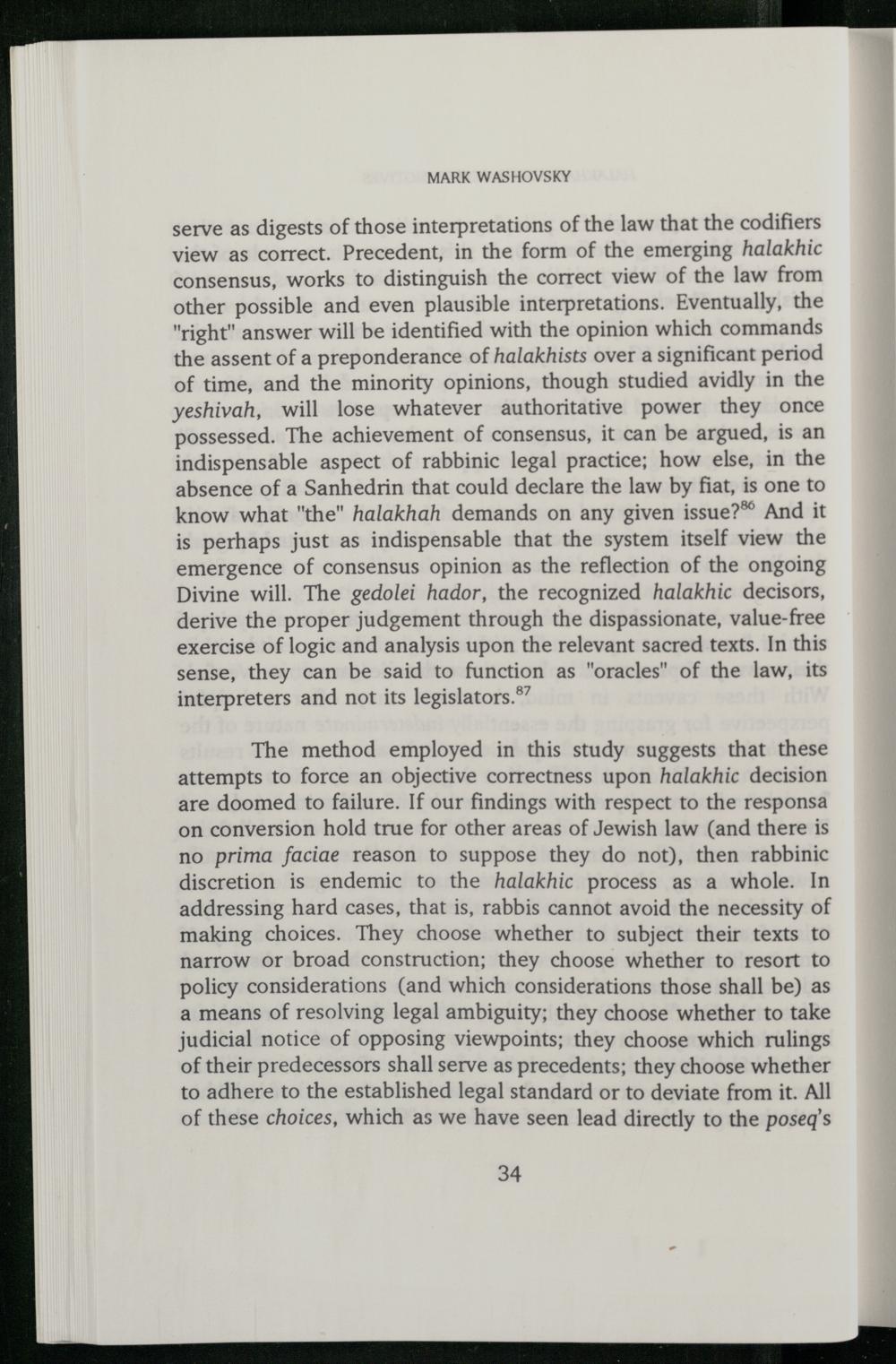 serve as digests of those interpretations of the law that the codifiers view as correct. Precedent, in the form of the emerging halakhic consensus, works to distinguish the correct view of the law from other possible and even plausible interpretations. Eventually, the "right" answer will be identified with the opinion which commands the assent of a preponderance of halakhists over a significant period of time, and the minority opinions, though studied avidly in the yeshivah, will lose whatever authoritative power they once possessed. The achievement of consensus, it can be argued, is an indispensable aspect of rabbinic legal practice; how else, in the absence of a Sanhedrin that could declare the law by fiat, is one to know what"the" halakhah demands on any given issue?* And it is perhaps just as indispensable that the system itself view the emergence of consensus opinion as the reflection of the ongoing Divine will. The gedolei hador, the recognized halakhic decisors, derive the proper judgement through the dispassionate, value-free exercise of logic and analysis upon the relevant sacred texts. In this sense, they can be said to function as"oracles" of the law, its interpreters and not its legislators.®’