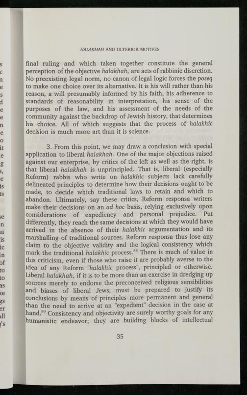 3. From this point, we may draw a conclusion with special application to liberal halakhah. One of the major objections raised against our enterprise, by critics of the left as well as the right, is that liberal halakhah is unprincipled. That is, liberal(especially Reform) rabbis who write on halakhic subjects lack carefully delineated principles to determine how their decisions ought to be made, to decide which traditional laws to retain and which to abandon. Ultimately, say these critics, Reform responsa writers make their decisions on an ad hoc basis, relying exclusively upon considerations of expediency and personal prejudice. Put differently, they reach the same decisions at which they would have arrived in the absence of their halakhic argumentation and its marshalling of traditional sources. Reform responsa thus lose any claim to the objective validity and the logical consistency which mark the traditional halakhic process.®® There is much of value in this criticism, even if those who raise it are probably averse to the idea of any Reform"halakhic process", principled or otherwise. Liberal halakhah, if it is to be more than an exercise in dredging up sources merely to endorse the preconceived religious sensibilities and biases of liberal Jews , must be prepared to justify its conclusions by means of principles more permanent and general than the need to arrive at an"expedient" decision in the case at hand.* Consistency and objectivity are surely worthy goals for any humanistic endeavor; they are building blocks of intellectual