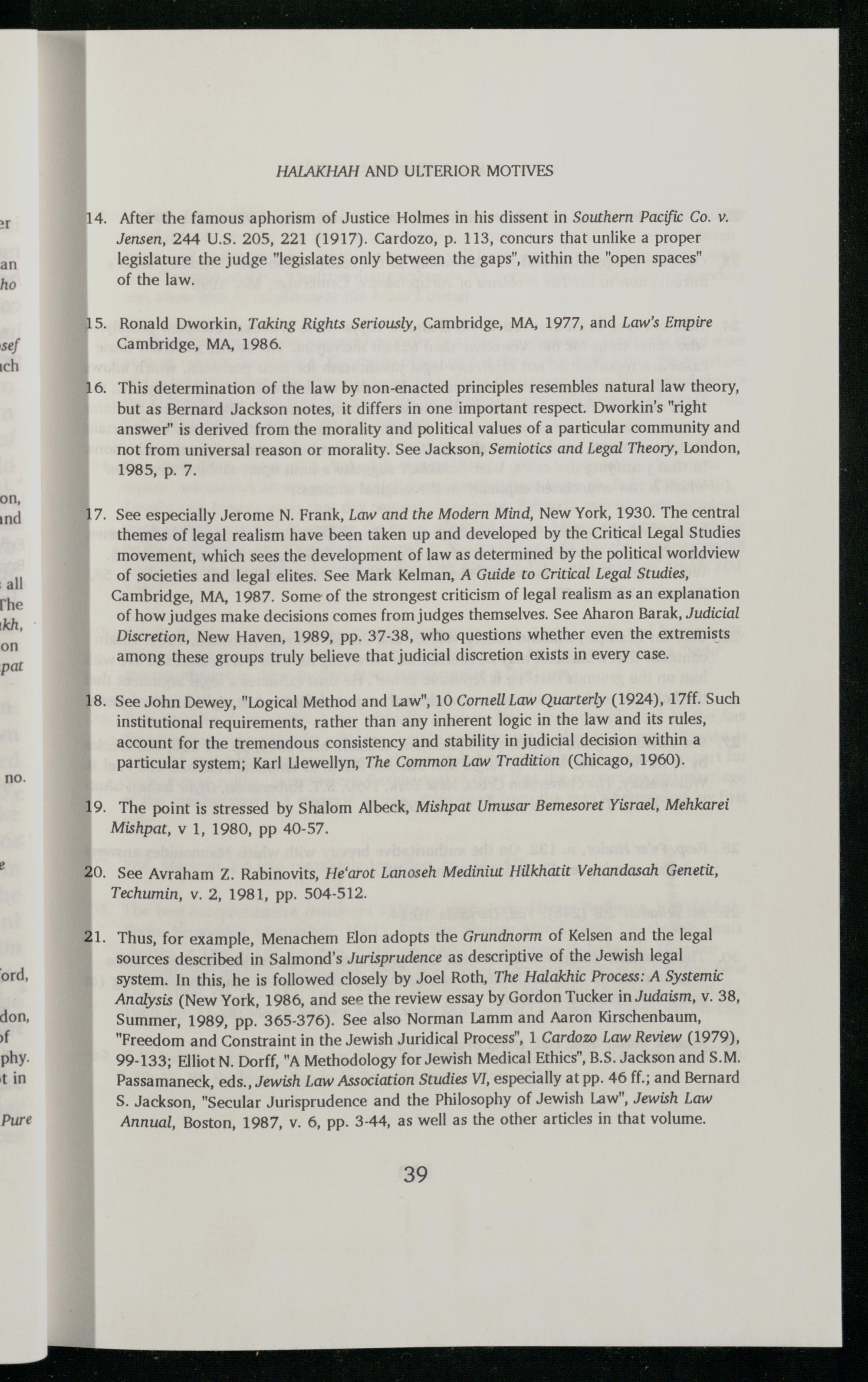 Thus, for example, Menachem Elon adopts the Grundnorm of Kelsen and the legal sources described in Salmond’s Jurisprudence as descriptive of the Jewish legal system. In this, he is followed closely by Joel Roth, The Halakhic Process: A Systemic Analysis(New York, 1986, and see the review essay by Gordon Tucker in Judaism, v. 38, Summer, 1989, pp. 365-376). See also Norman Lamm and Aaron Kirschenbaum, "Freedom and Constraint in the Jewish Juridical Process", 1 Cardozo Law Review(1979), 99-133; Elliot N. Dorff,"A Methodology for Jewish Medical Ethics", B.S. Jackson and S.M. Passamaneck, eds., Jewish Law Association Studies VI, especially at pp. 46 ff.; and Bernard S. Jackson,"Secular Jurisprudence and the Philosophy of Jewish Law", Jewish Law Annual, Boston, 1987, v. 6, pp. 3-44, as well as the other articles in that volume.