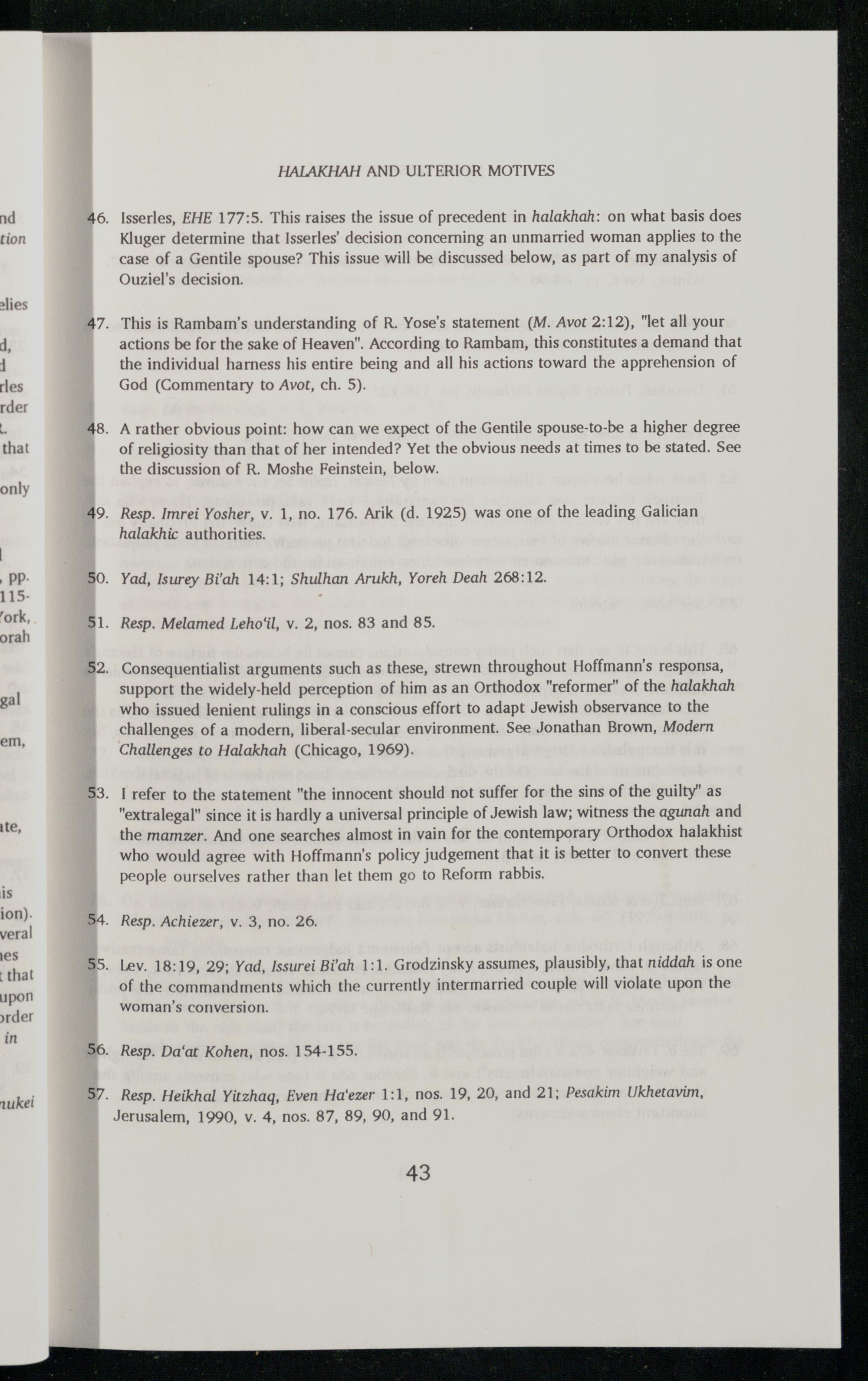 I refer to the statement"the innocent should not suffer for the sins of the guilty" as "extralegal" since it is hardly a universal principle of Jewish law; witness the agunah and the mamzer. And one searches almost in vain for the contemporary Orthodox halakhist who would agree with Hoffmann’s policy judgement that it is better to convert these people ourselves rather than let them go to Reform rabbis.