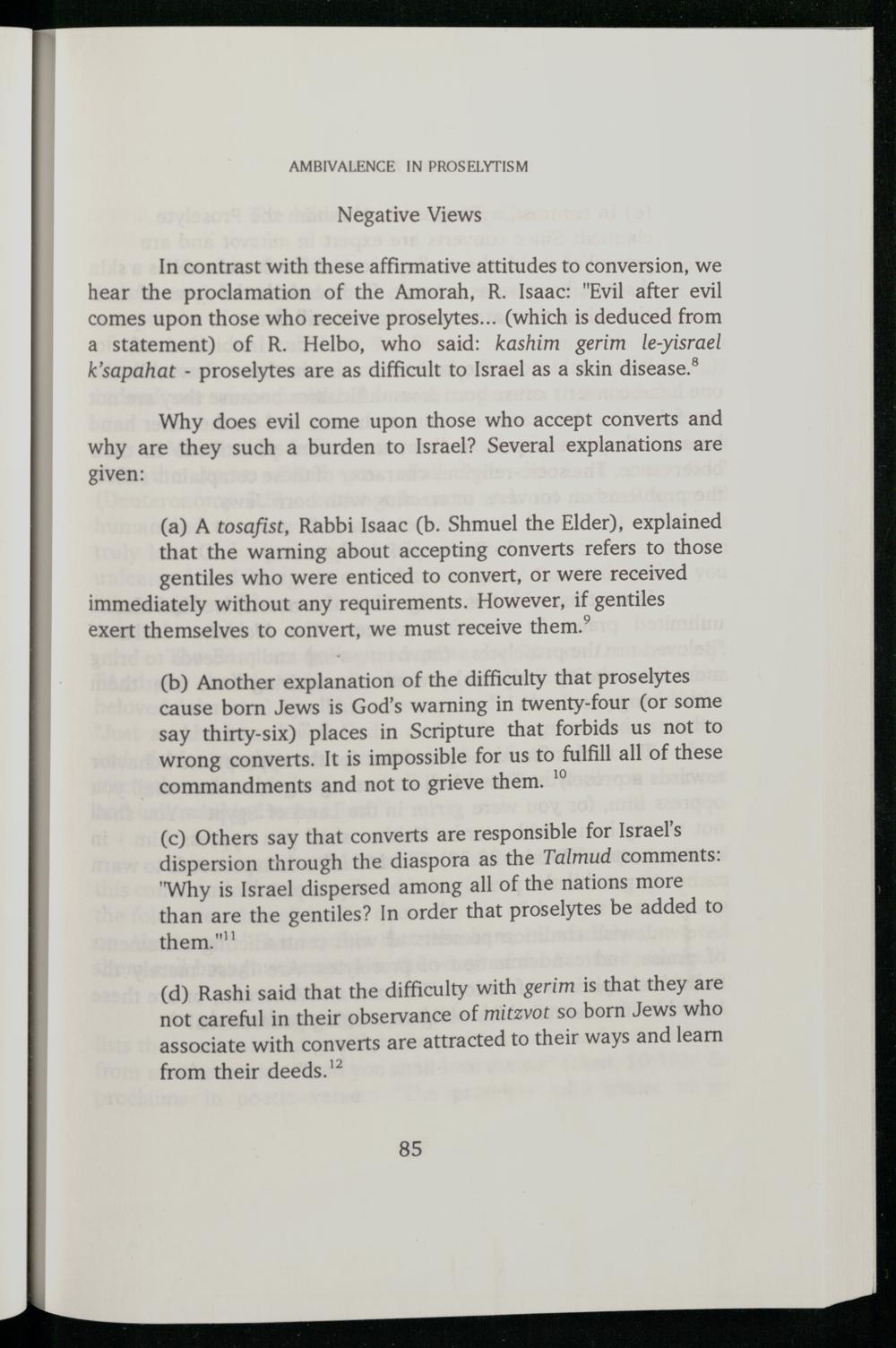 In contrast with these affirmative attitudes to conversion, we hear the proclamation of the Amorah, R. Isaac:"Evil after evil comes upon those who receive proselytes...(which is deduced from a statement) of R. Helbo, who said: kashim gerim le-yisrael k’sapahat- proselytes are as difficult to Israel as a skin disease.’
