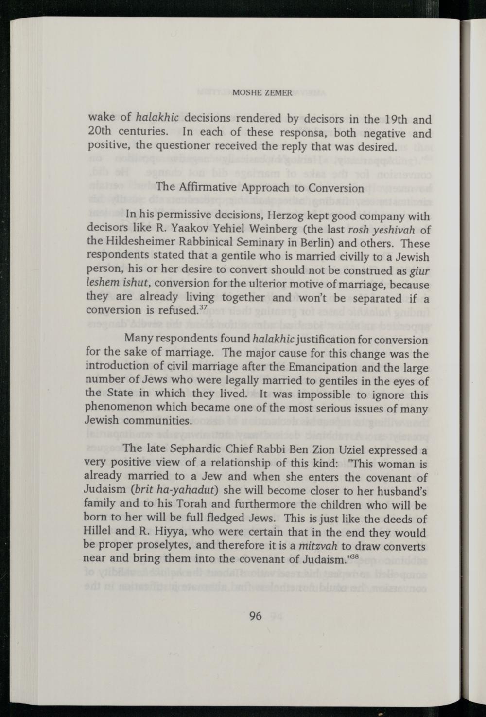 Many respondents found halakhic justification for conversion for the sake of marriage. The major cause for this change was the introduction of civil marriage after the Emancipation and the large number of Jews who were legally married to gentiles in the eyes of the State in which they lived. It was impossible to ignore this phenomenon which became one of the most serious issues of many Jewish communities.