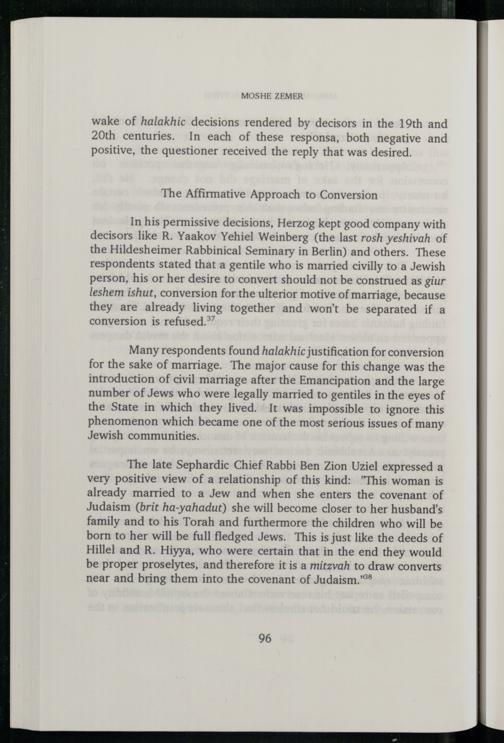 In his permissive decisions, Herzog kept good company with decisors like R. Yaakov Yehiel Weinberg(the last rosh yeshivah of the Hildesheimer Rabbinical Seminary in Berlin ) and others. These respondents stated that a gentile who is married civilly to a Jewish person, his or her desire to convert should not be construed as giur leshem ishut, conversion for the ulterior motive of marriage, because they are already living together and won't be separated if a conversion is refused.’