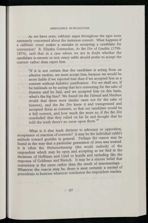 What is it that leads decisors to advocacy or opposition, acceptance or reaction of converts? It may be the individual rabbi’s attitude toward gentiles in general. Perhaps the reason may be found in the way that a particular generation of Jews was treated. It is often the Weltanschauung (the world outlook ) of the respondent which may be open and accepting as we find in the decisions of Hoffman and Uziel or hostile and excluding like the responsa of Goldman and Breisch. It may be a sincere belief that conversion is the cause rather than the result of intermarriage. Whatever the reason may be, there is most certainly a myriad of precedents to buttress whatever conclusion the respondent reaches.