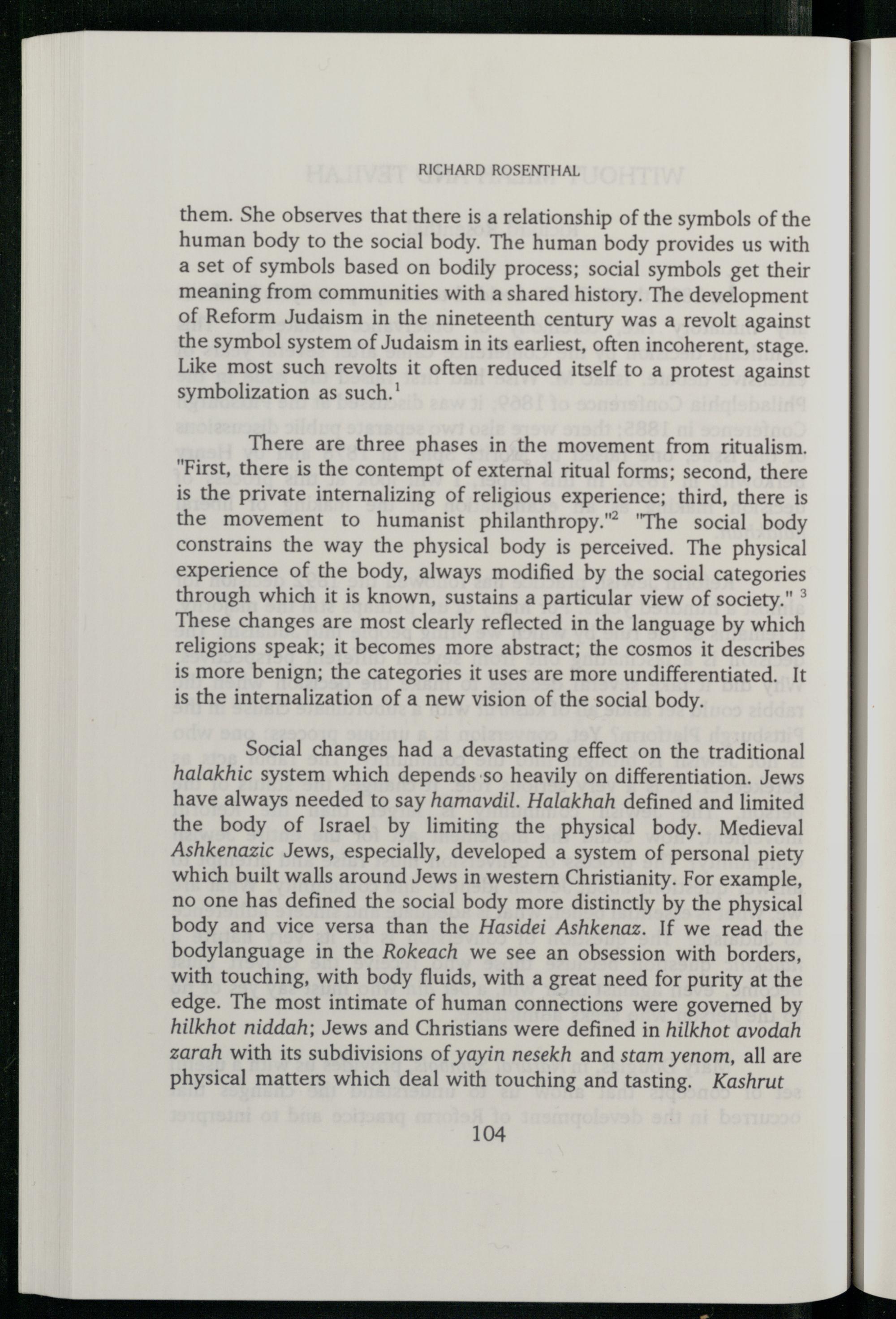 them. She observes that there is a relationship of the symbols of the human body to the social body. The human body provides us with a set of symbols based on bodily process; social symbols get their meaning from communities with a shared history. The development of Reform Judaism in the nineteenth century was a revolt against the symbol system of Judaism in its earliest, often incoherent, stage. Like most such revolts it often reduced itself to a protest against symbolization as such.’