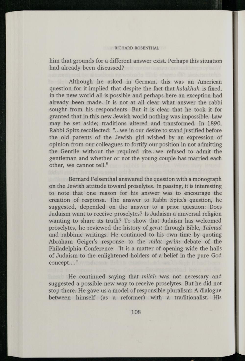 Bernard Felsenthal answered the question with a monograph on the Jewish attitude toward proselytes. In passing, it is interesting to note that one reason for his answer was to encourage the creation of responsa. The answer to Rabbi Spitz’s question, he suggested, depended on the answer to a prior question: Does Judaism want to receive proselytes? Is Judaism a universal religion wanting to share its truth? To show that Judaism has welcomed proselytes, he reviewed the history of gerut through Bible , Talmud and rabbinic writings. He continued to his own time by quoting Abraham Geiger 's response to the milat gerim debate of the Philadelphia Conference:"It is a matter of opening wide the halls of Judaism to the enlightened holders of a belief in the pure God concept..."