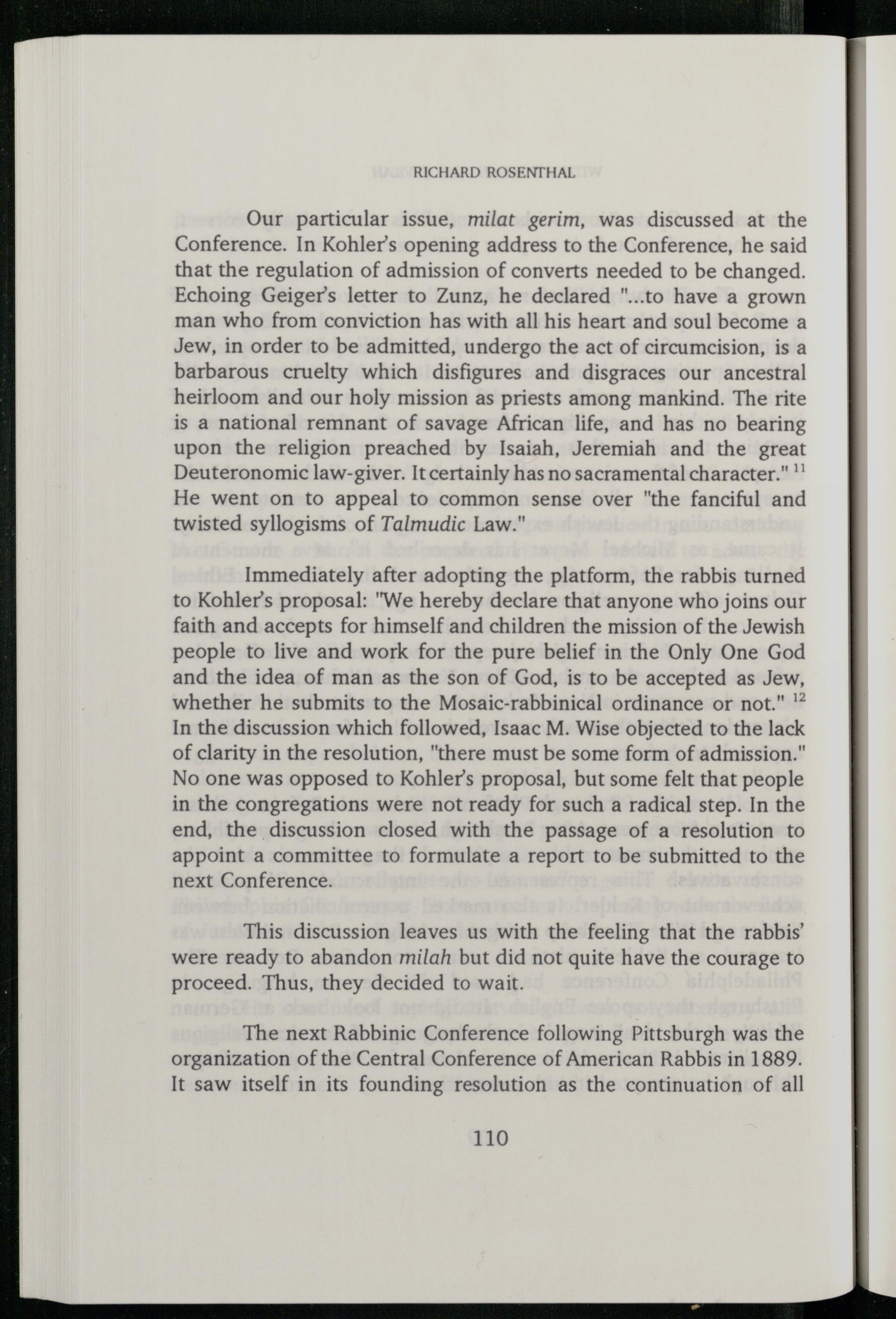 Our particular issue, milat gerim, was discussed at the Conference. In Kohler’s opening address to the Conference, he said that the regulation of admission of converts needed to be changed. Echoing Geiger’s letter to Zunz , he declared"...to have a grown man who from conviction has with all his heart and soul become a Jew , in order to be admitted, undergo the act of circumcision, is a barbarous cruelty which disfigures and disgraces our ancestral heirloom and our holy mission as priests among mankind. The rite is a national remnant of savage African life, and has no bearing upon the religion preached by Isaiah, Jeremiah and the great Deuteronomic law-giver. It certainly has no sacramental character." He went on to appeal to common sense over"the fanciful and twisted syllogisms of Talmudic Law."